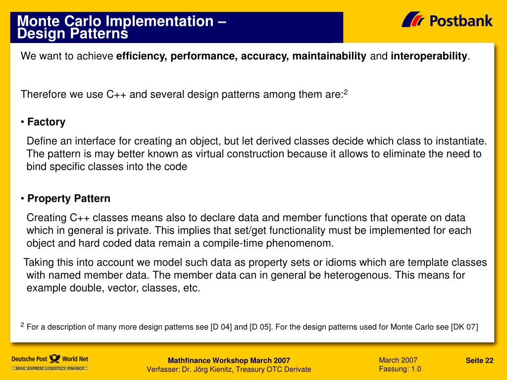 Monte Carlo Implementation – Design Patterns • We want to achieve efficiency, performance, accuracy, maintainability and interoperability. • Therefore we use C++ and several design patterns among them are:2 • Factory • Define an interface for creating an object, but let derived classes decide which class to instantiate. The pattern is may better known as virtual construction because it allows to eliminate the need to bind specific classes into the code • Property Pattern • Creating C++ classes means also to declare data and member functions that operate on data which in general is private. This implies that set/get functionality must be implemented for each object and hard coded data remain a compile-time phenomenom. • Taking this into account we model such data as property sets or idioms which are template classes with named member data. The member data can in general be heterogenous. This means for example double, vector, classes, etc. 2For a description of many more design patterns see [D 04] and [D 05]. For the design patterns used for Monte Carlo see [DK 07]