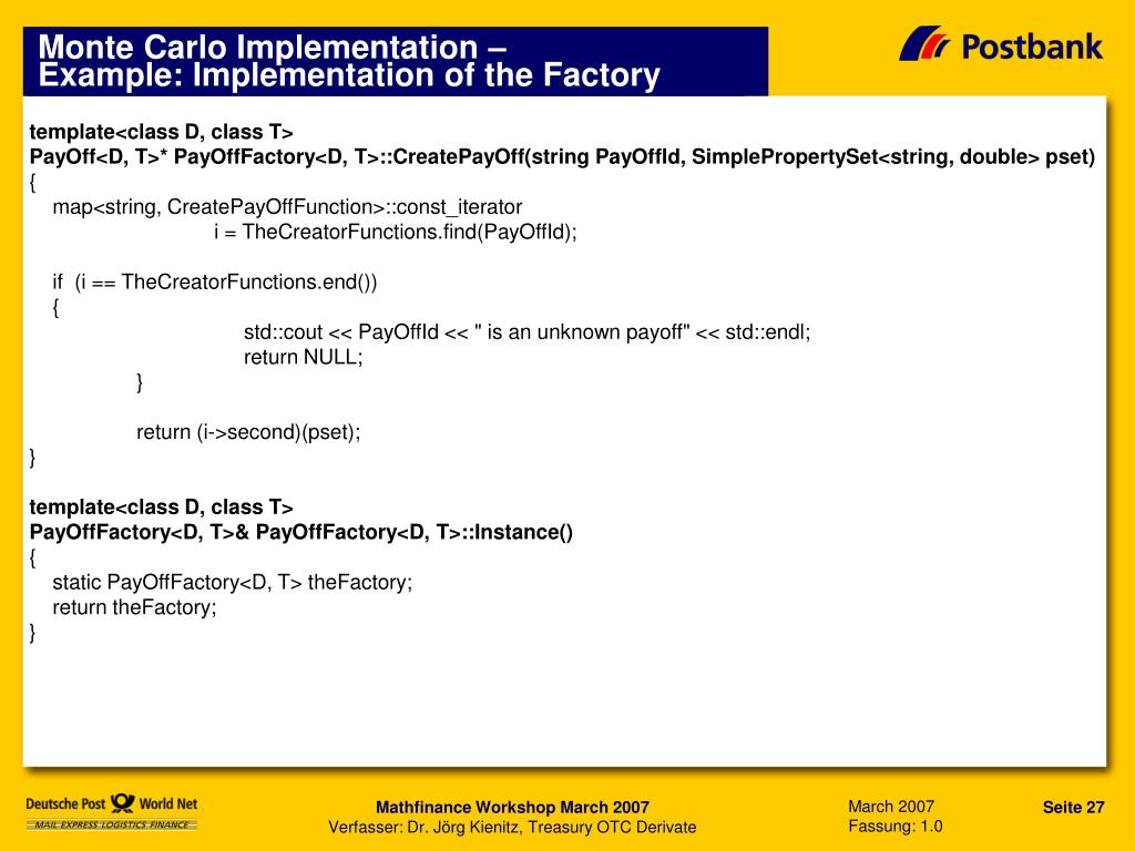 Monte Carlo Implementation – Example: PayOff Construction using Factory class PayOffConstructor { public: PayOffConstructor(std::string); static PayOff<D, T>* Create(SimplePropertySet<string, double>); }; template <class D, class T, class P> PayOffConstructor<D,T,P>::PayOffConstructor(std::string id) { PayOffFactory<D, T>& thePayOffFactory = PayOffFactory<D, T>::Instance(); thePayOffFactory.RegisterPayOff(id,PayOffConstructor<D,T,P>::Create); } template <class D, class T, class P> PayOff<D, T>* PayOffConstructor<D, T, P>::Create(SimplePropertySet<string, double> pset) { return new P(pset); }