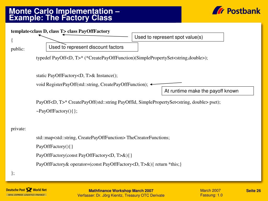 Monte Carlo Implementation – Example: The Factory Class template<class D, class T> class PayOffFactory { public: typedef PayOff<D, T>* (*CreatePayOffFunction)(SimplePropertySet<string,double>); static PayOffFactory<D, T>& Instance(); void RegisterPayOff(std::string, CreatePayOffFunction); PayOff<D, T>* CreatePayOff(std::string PayOffId, SimplePropertySet<string, double> pset); ~PayOffFactory(){}; private: std::map<std::string, CreatePayOffFunction> TheCreatorFunctions; PayOffFactory(){} PayOffFactory(const PayOffFactory<D, T>&){} PayOffFactory& operator=(const PayOffFactory<D, T>&){ return *this;} }; Used to represent spot value(s) Used to represent discount factors At runtime make the payoff known
