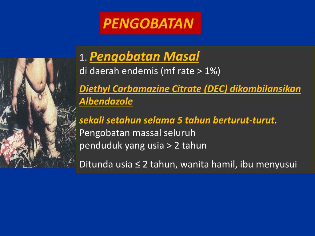 PENGOBATAN 1. PengobatanMasal di daerah endemis (mf rate > 1%) Diethyl CarbamazineCitrate (DEC) dikombilansikanAlbendazole sekalisetahunselama 5 tahunberturut-turut. Pengobatanmassalseluruh pendudukyang usia > 2 tahun Ditundausia≤ 2 tahun, wanitahamil, ibumenyusui
