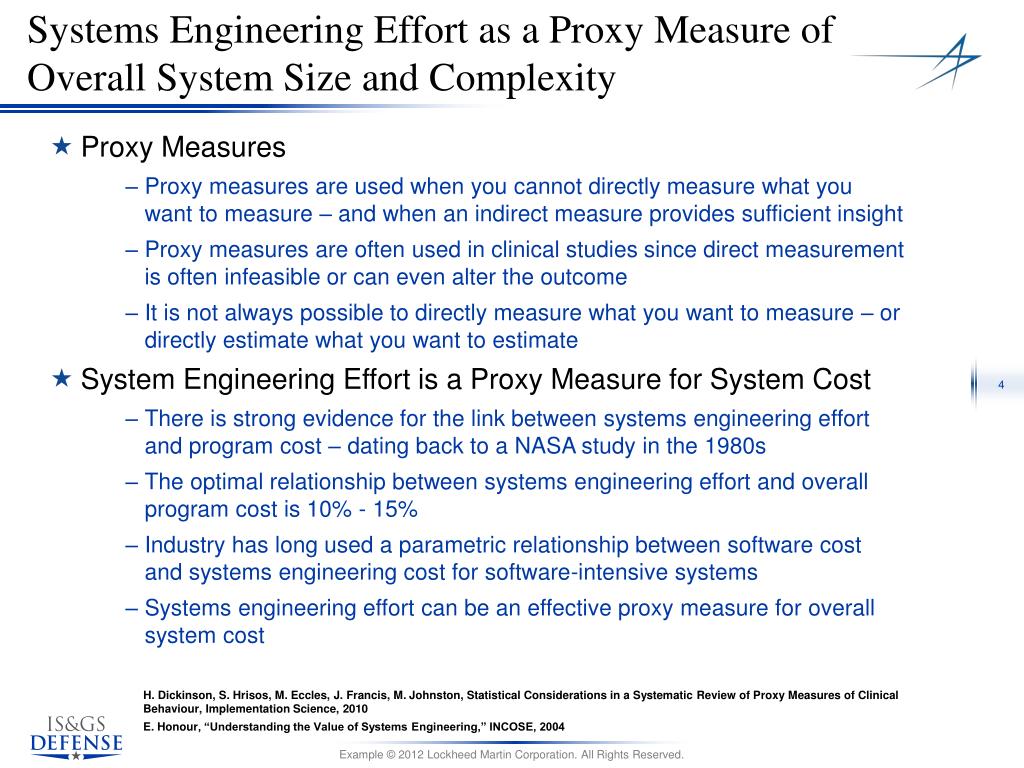 Systems Engineering Effort as a Proxy Measure of Overall System Size and Complexity • Proxy Measures • Proxy measures are used when you cannot directly measure what you want to measure – and when an indirect measure provides sufficient insight • Proxy measures are often used in clinical studies since direct measurement is often infeasible or can even alter the outcome • It is not always possible to directly measure what you want to measure – or directly estimate what you want to estimate • System Engineering Effort is a Proxy Measure for System Cost • There is strong evidence for the link between systems engineering effort and program cost – dating back to a NASA study in the 1980s • The optimal relationship between systems engineering effort and overall program cost is 10% - 15% • Industry has long used a parametric relationship between software cost and systems engineering cost for software-intensive systems • Systems engineering effort can be an effective proxy measure for overall system cost H. Dickinson, S. Hrisos, M. Eccles, J. Francis, M. Johnston, Statistical Considerations in a Systematic Review of Proxy Measures of Clinical Behaviour, Implementation Science, 2010 E. Honour, “Understanding the Value of Systems Engineering,” INCOSE, 2004