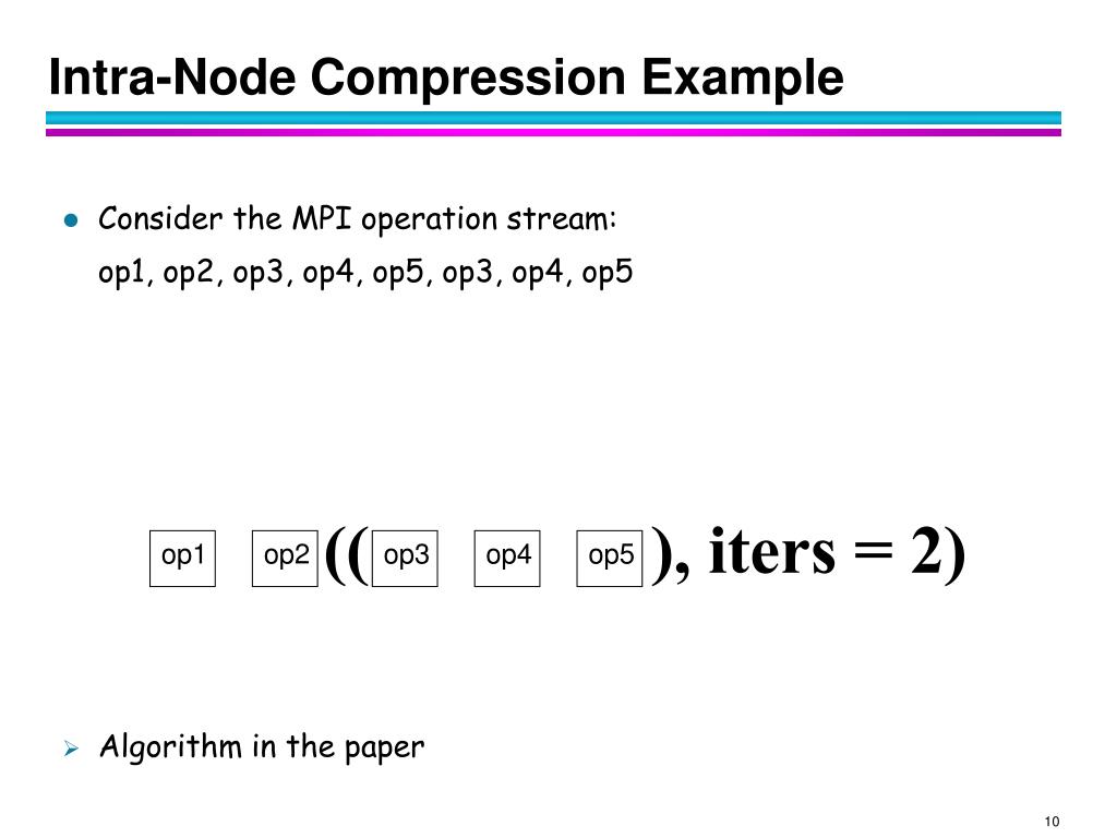 op1 op2 op3 op4 op5 Intra-Node Compression Example • Consider the MPI operation stream: op1, op2, op3, op4, op5, op3, op4, op5 • Algorithm in the paper (( ), iters = 2)