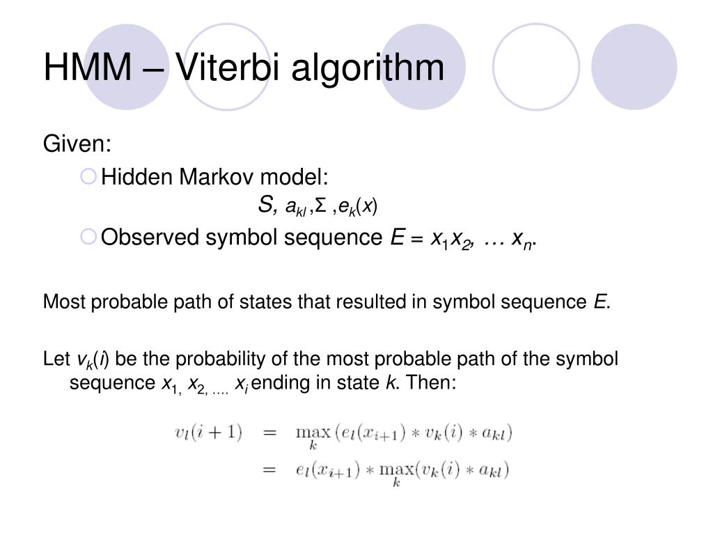 HMM – Viterbi algorithm Given: • Hidden Markov model: S, akl ,Σ ,ek(x) • Observed symbol sequence E = x1x2, … xn. Most probable path of states that resulted in symbol sequence E. Let vk(i) be the probability of the most probable path of the symbol sequence x1, x2, …. xi ending in state k. Then: