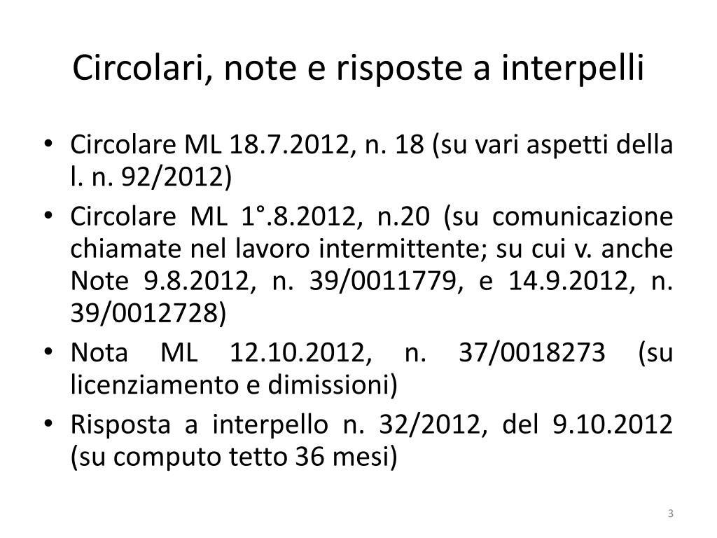 Circolari, note e risposte a interpelli • Circolare ML 18.7.2012, n. 18 (su vari aspetti della l. n. 92/2012) • Circolare ML 1°.8.2012, n.20 (su comunicazione chiamate nel lavoro intermittente; su cui v. anche Note 9.8.2012, n. 39/0011779, e 14.9.2012, n. 39/0012728) • Nota ML 12.10.2012, n. 37/0018273 (su licenziamento e dimissioni) • Risposta a interpello n. 32/2012, del 9.10.2012 (su computo tetto 36 mesi)