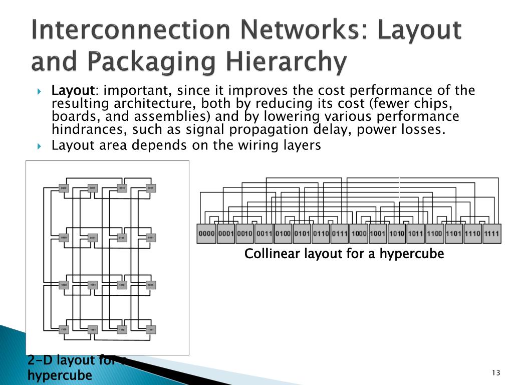Interconnection Networks: Layout and Packaging Hierarchy • Layout: important, since it improves the cost performance of the resulting architecture, both by reducing its cost (fewer chips, boards, and assemblies) and by lowering various performance hindrances, such as signal propagation delay, power losses. • Layout area depends on the wiring layers Collinear layout for a hypercube 2-D layout for a hypercube