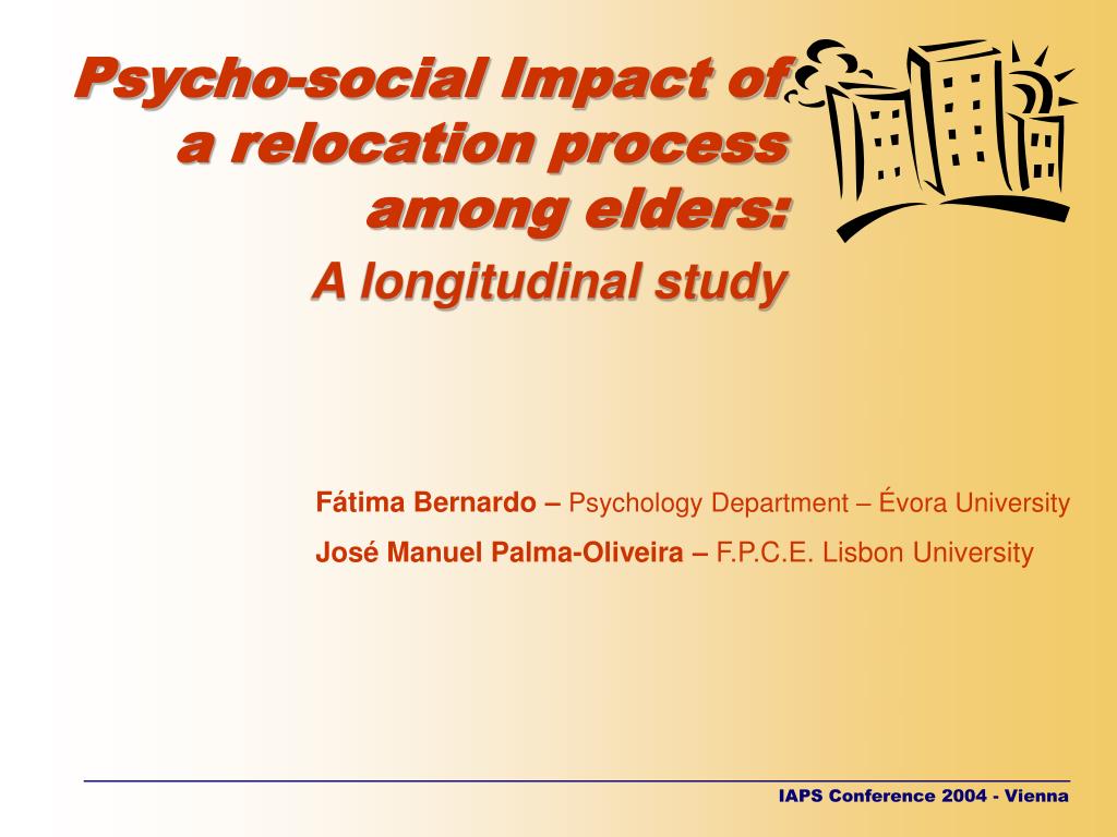 Psycho-social Impact of a relocation process among elders: A longitudinal study Fátima Bernardo – Psychology Department – Évora University José Manuel Palma-Oliveira – F.P.C.E. Lisbon University