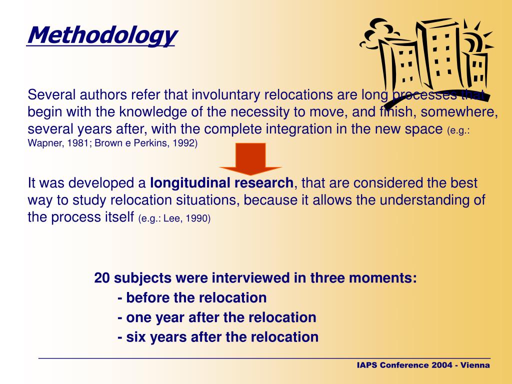 Methodology Several authors refer that involuntary relocations are long processes that begin with the knowledge of the necessity to move, and finish, somewhere, several years after, with the complete integration in the new space (e.g.: Wapner, 1981; Brown e Perkins, 1992) It was developed a longitudinal research, that are considered the best way to study relocation situations, because it allows the understanding of the process itself (e.g.: Lee, 1990) 20 subjects were interviewed in three moments: - before the relocation - one year after the relocation - six years after the relocation
