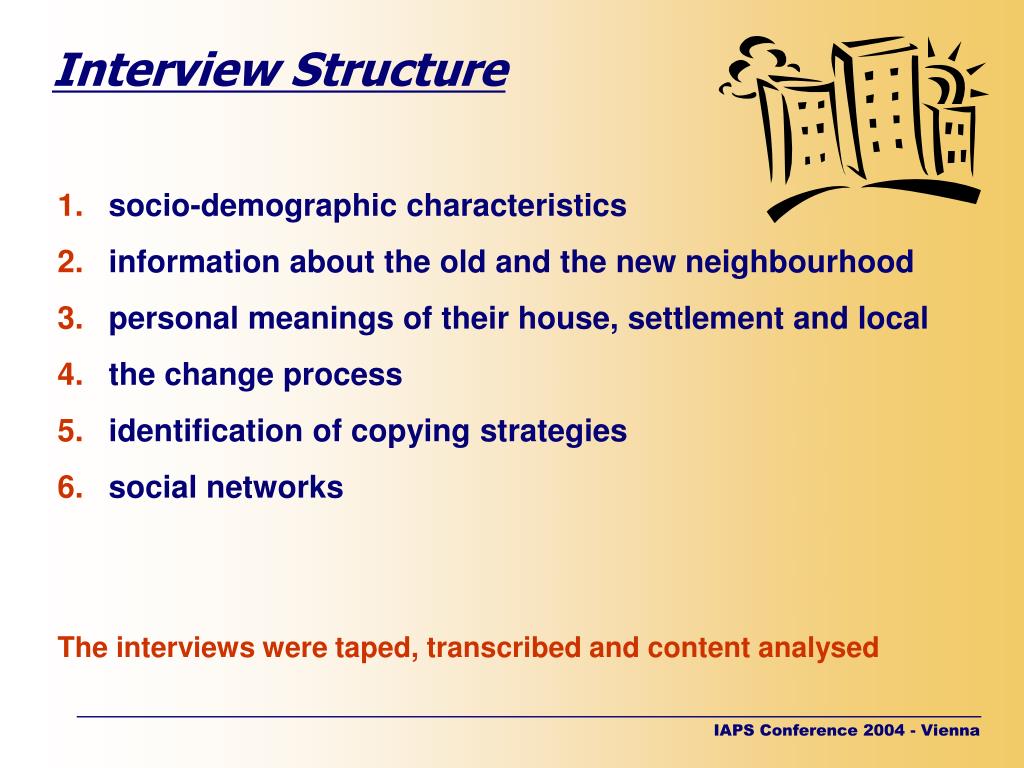 Interview Structure • socio-demographic characteristics • information about the old and the new neighbourhood • personal meanings of their house, settlement and local • the change process • identification of copying strategies • social networks • The interviews were taped, transcribed and content analysed