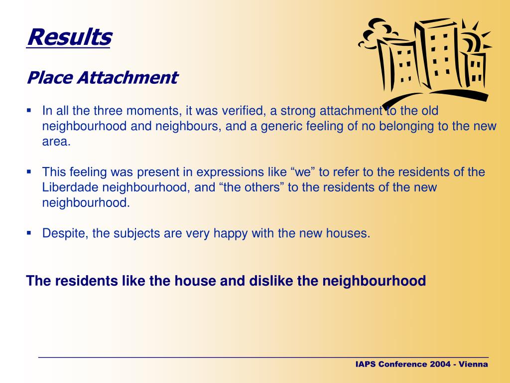 Results • There are important impacts of the relocation in the resident’s relationship with their physical and social environment. • Place Identity • This study verifies that the change in the physical and social environment had impact on the relocated people’s identity. It demanded a process of adjustment of the identity to the new space. • In the old neighbourhood it was verified that the place contributed to a positive identity of the residents • In the new neighbourhood it was verified that: • - The residents use the Old neighbourhood as an element of distintiveness from the others “We are different because we are from the Liberdade neighbourhood” • - Has elements of descontinuity between the past and the present • -The house contributed to the increased self-esteem and self-efficacy. • - Theneighbourhood and neighbours contributed to the decreased self-esteem and self-efficacy