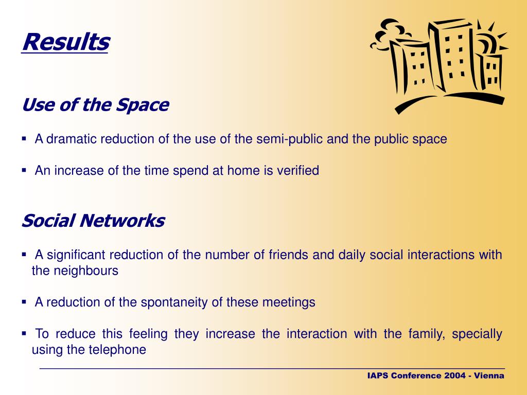 Results • Use of the Space • A dramatic reduction of the use of the semi-public and the public space • An increase of the time spend at home is verified • Social Networks • A significant reduction of the number of friends and daily social interactions with the neighbours • A reduction of the spontaneity of these meetings • To reduce this feeling they increase the interaction with the family, specially using the telephone