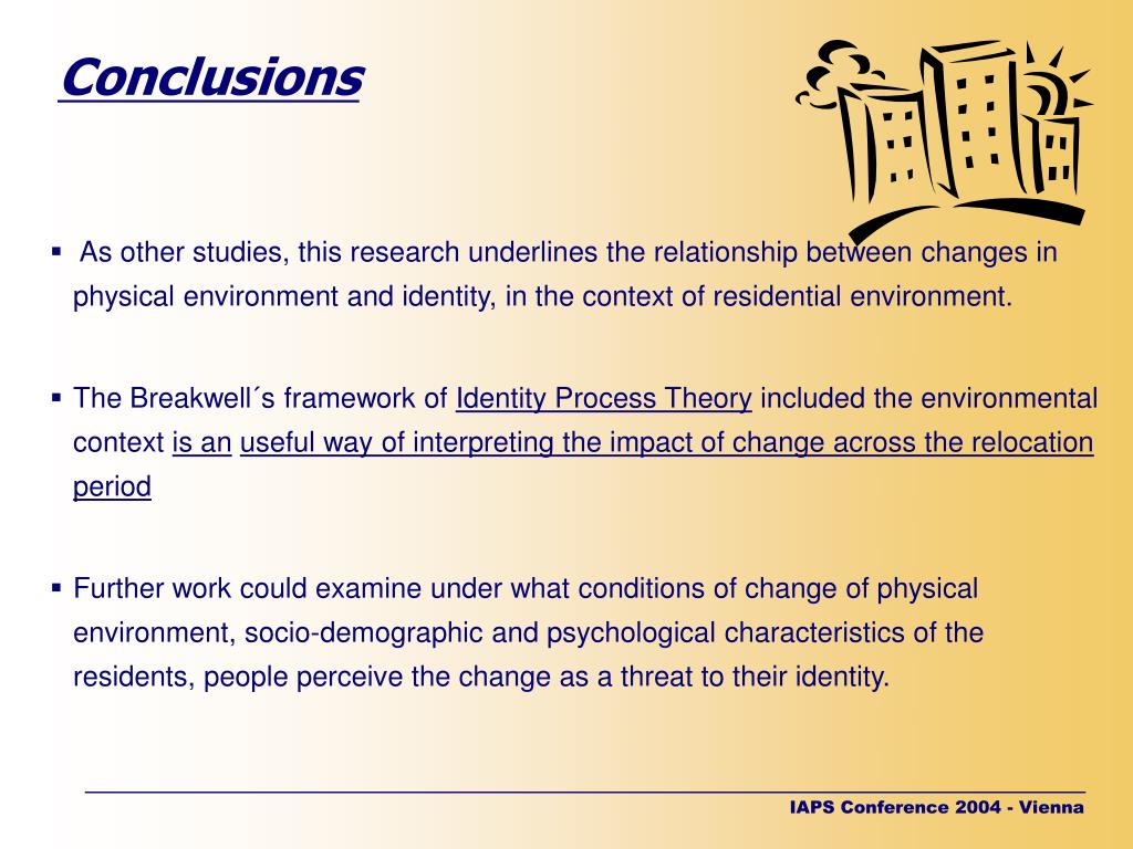 Conclusions • As other studies, this research underlines the relationship between changes in physical environment and identity, in the context of residential environment. • The Breakwell´s framework of Identity Process Theory included the environmental context is anuseful way of interpreting the impact of change across the relocation period • Further work could examine under what conditions of change of physical environment, socio-demographic and psychological characteristics of the residents, people perceive the change as a threat to their identity.