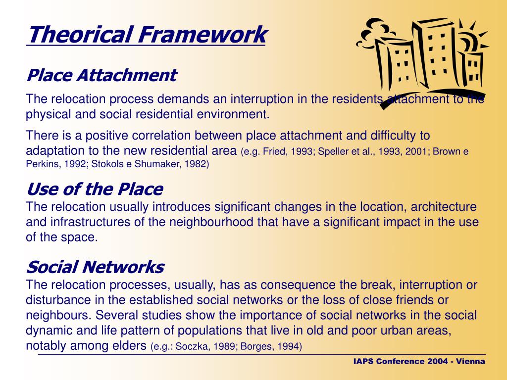 Theorical Framework Place Attachment The relocation process demands an interruption in the residents attachment to the physical and social residential environment. There is a positive correlation between place attachment and difficulty to adaptation to the new residential area (e.g. Fried, 1993; Speller et al., 1993, 2001; Brown e Perkins, 1992; Stokols e Shumaker, 1982) Use of the Place The relocation usually introduces significant changes in the location, architecture and infrastructures of the neighbourhood that have a significant impact in the use of the space. Social Networks The relocation processes, usually, has as consequence the break, interruption or disturbance in the established social networks or the loss of close friends or neighbours. Several studies show the importance of social networks in the social dynamic and life pattern of populations that live in old and poor urban areas, notably among elders (e.g.: Soczka, 1989; Borges, 1994)