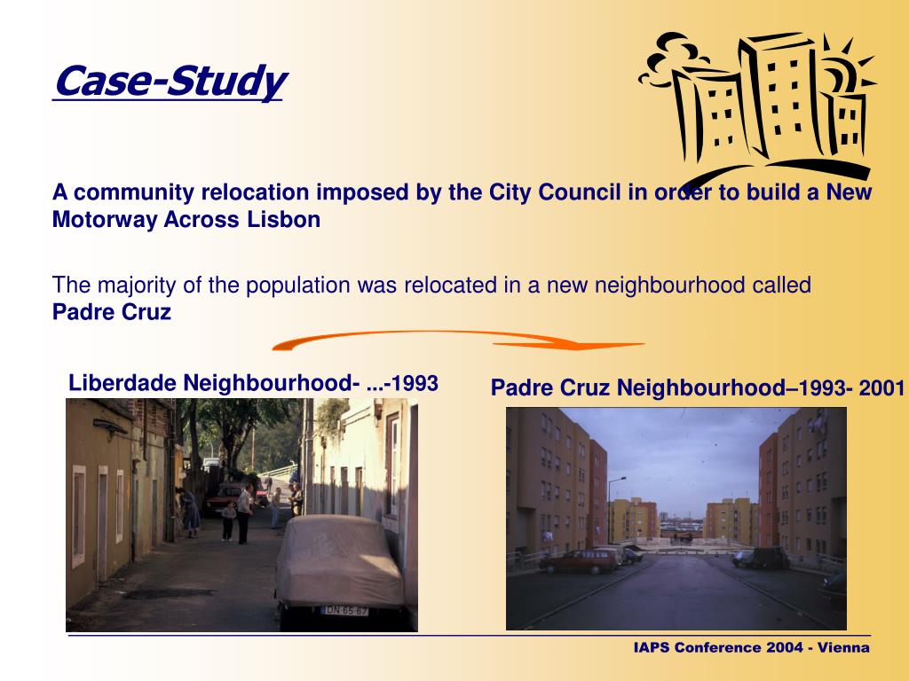 Case-Study A community relocation imposed by the City Council in order to build a New Motorway Across Lisbon The majority of the population was relocated in a new neighbourhood called Padre Cruz Liberdade Neighbourhood- ...-1993 Padre Cruz Neighbourhood–1993- 2001
