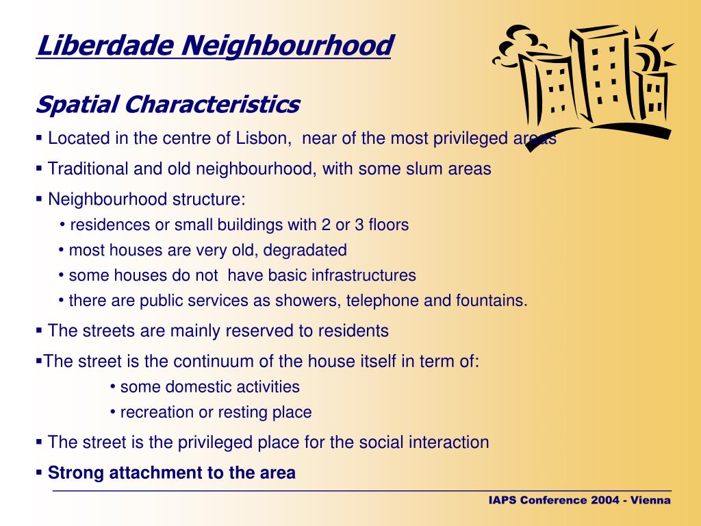 Liberdade Neighbourhood • Spatial Characteristics • Located in the centre of Lisbon, near of the most privileged areas • Traditional and old neighbourhood, with some slum areas • Neighbourhood structure: • •residences or small buildings with 2 or 3 floors • • most houses are very old, degradated • • some houses do not have basic infrastructures • • there are public services as showers, telephone and fountains. • The streets are mainly reserved to residents • The street is the continuum of the house itself in term of: • • some domestic activities • • recreation or resting place • The street is the privileged place for the social interaction • Strong attachment to the area
