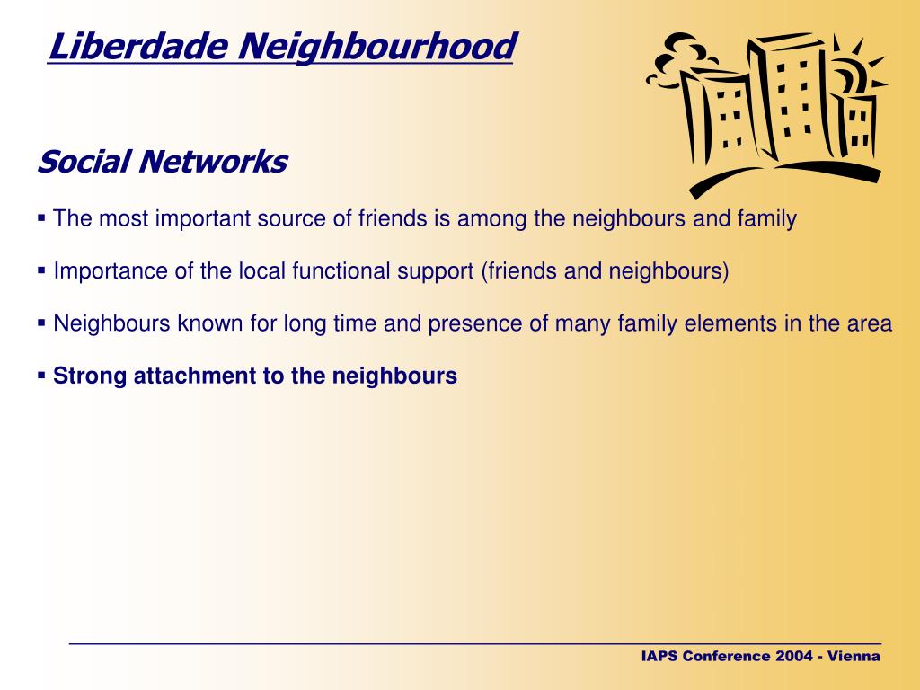 Liberdade Neighbourhood • Social Networks • The most important source of friends is among the neighbours and family • Importance of the local functional support (friends and neighbours) • Neighbours known for long time and presence of many family elements in the area • Strong attachment to the neighbours