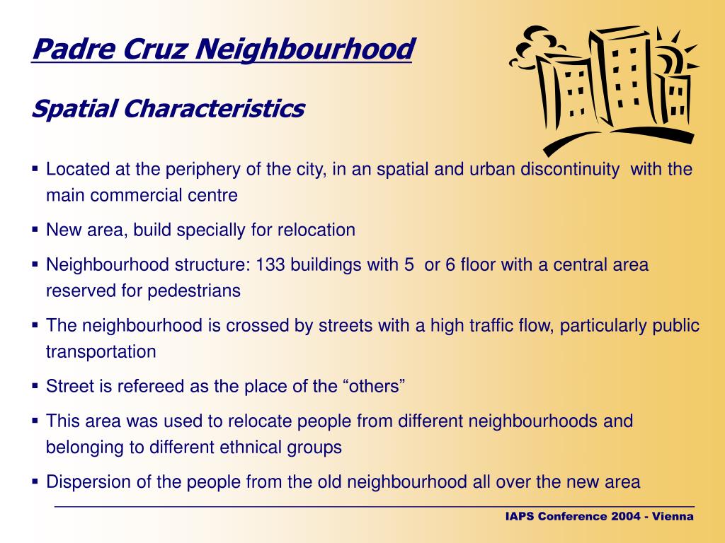 Padre Cruz Neighbourhood • Spatial Characteristics • Located at the periphery of the city, in an spatial and urban discontinuity with the main commercial centre • New area, build specially for relocation • Neighbourhood structure: 133 buildings with 5 or 6 floor with a central area reserved for pedestrians • The neighbourhood is crossed by streets with a high traffic flow, particularly public transportation • Street is refereed as the place of the “others” • This area was used to relocate people from different neighbourhoods andbelonging to different ethnical groups • Dispersion of the people from the old neighbourhood all over the new area
