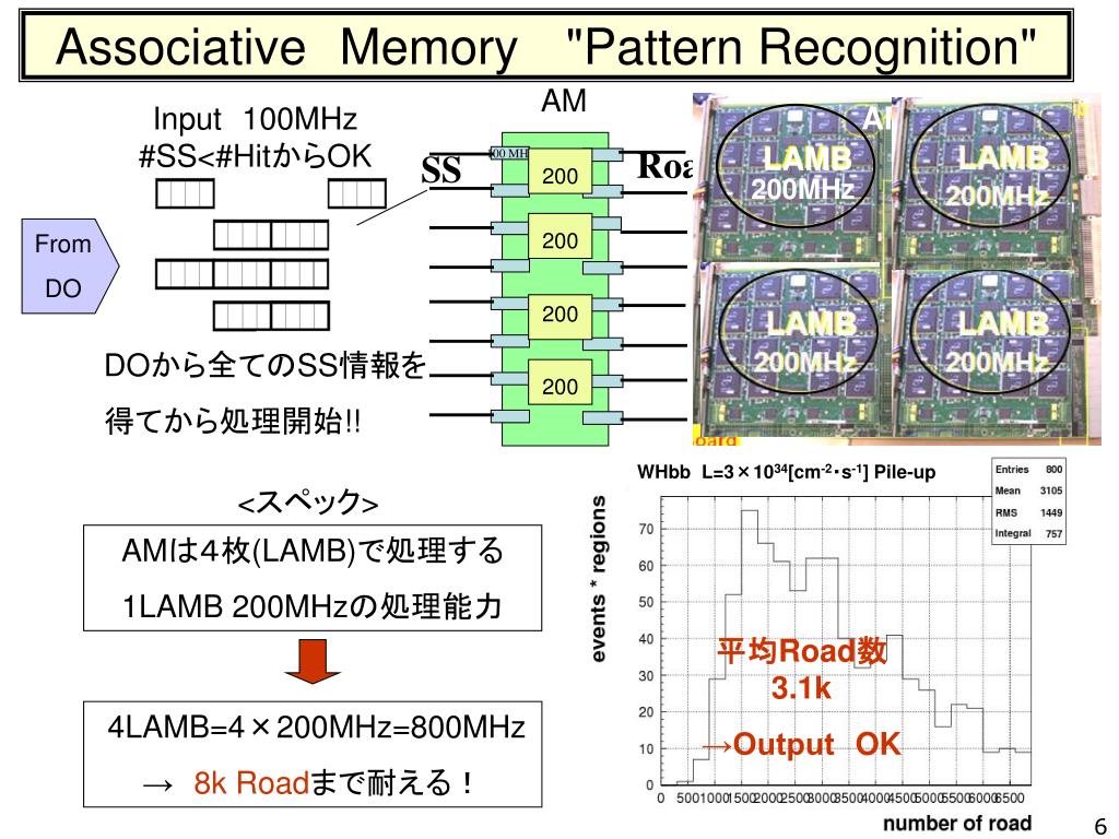 AssociativeMemory "Pattern Recognition" AM WHbb L=3×1034[cm-2・s-1] Pile-up Road SS 100 MHz 200 200 平均Road数 3.1k →OutputOK 200 200 Input100MHz #SS<#HitからOK AM LAMB 200MHz From DO DOから全てのSS情報を 得てから処理開始!! <スペック> AMは4枚(LAMB)で処理する 1LAMB 200MHzの処理能力 4LAMB=4×200MHz=800MHz → 8k Roadまで耐える! 6