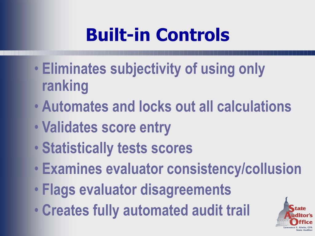 Built-in Controls • Eliminates subjectivity of using only ranking • Automates and locks out all calculations • Validates score entry • Statistically tests scores • Examines evaluator consistency/collusion • Flags evaluator disagreements • Creates fully automated audit trail