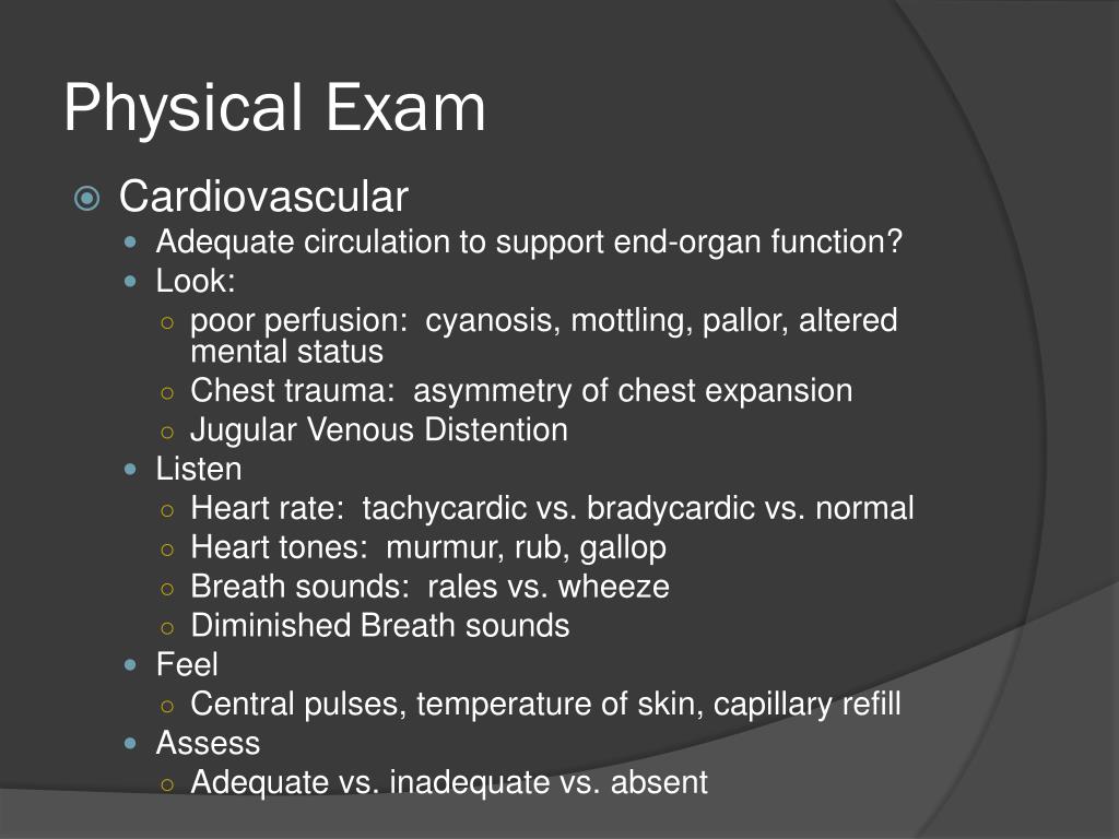Physical Exam • Cardiovascular • Adequate circulation to support end-organ function? • Look: • poor perfusion: cyanosis, mottling, pallor, altered mental status • Chest trauma: asymmetry of chest expansion • Jugular Venous Distention • Listen • Heart rate: tachycardicvs. bradycardicvs. normal • Heart tones: murmur, rub, gallop • Breath sounds: ralesvs. wheeze • Diminished Breath sounds • Feel • Central pulses, temperature of skin, capillary refill • Assess • Adequate vs. inadequate vs. absent