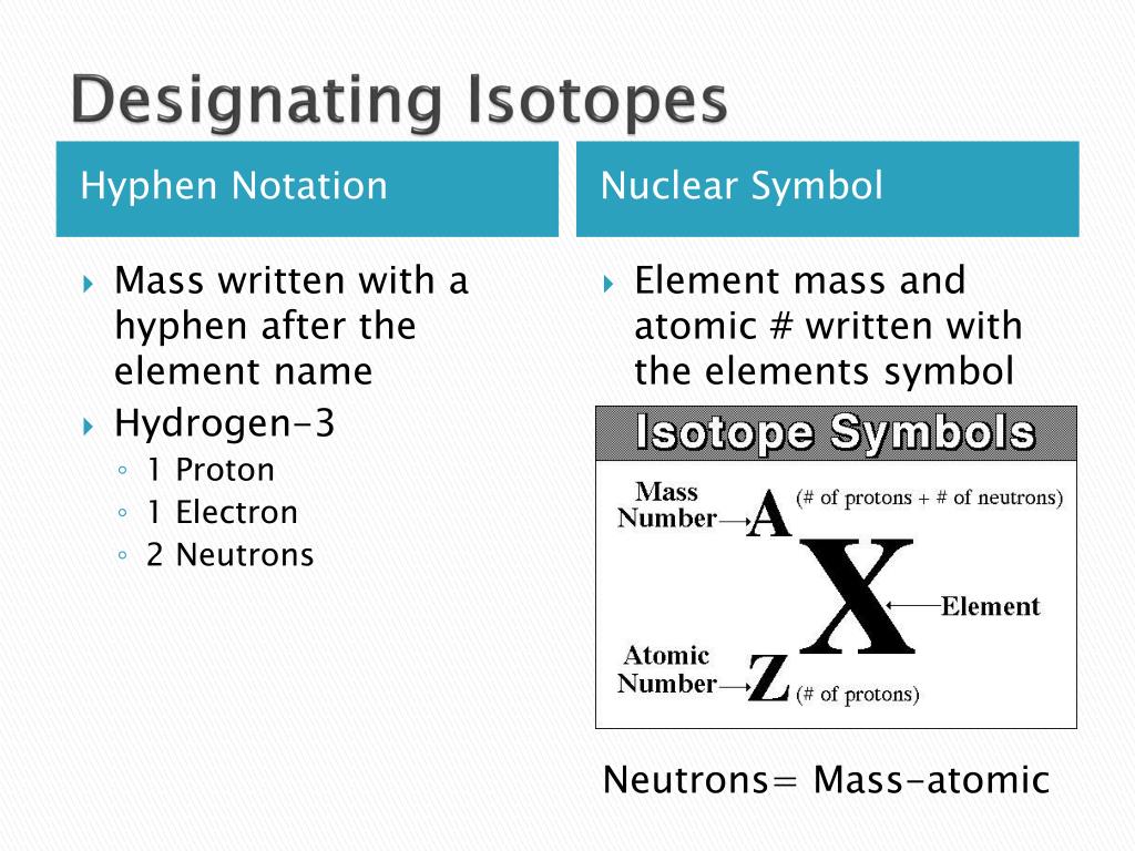 Designating Isotopes • Mass written with a hyphen after the element name • Hydrogen-3 • 1 Proton • 1 Electron • 2 Neutrons • Element mass and atomic # written with the elements symbol Neutrons= Mass-atomic Hyphen Notation Nuclear Symbol