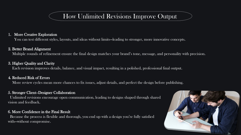 How Unlimited Revisions Improve Output 1. 1. More More Creative Exploration Creative Exploration You can test different styles, layouts, and ideas without limits—leading to stronger, more innovative concepts. 2. Better Brand Alignment 2. Better Brand Alignment Multiple rounds of refinement ensure the final design matches your brand’s tone, message, and personality with precision. 3. Higher Quality and Clarity 3. Higher Quality and Clarity Each revision improves details, balance, and visual impact, resulting in a polished, professional final output. 4. Reduced Risk of Errors 4. Reduced Risk of Errors More review cycles mean more chances to fix issues, adjust details, and perfect the design before publishing. 5. Stronger Client 5. Stronger Client– –Designer Collaboration Designer Collaboration Unlimited revisions encourage open communication, leading to designs shaped through shared vision and feedback. 6. More Confidence in the Final Result 6. More Confidence in the Final Result Because the process is flexible and thorough, you end up with a design you’re fully satisfied with—without compromise.