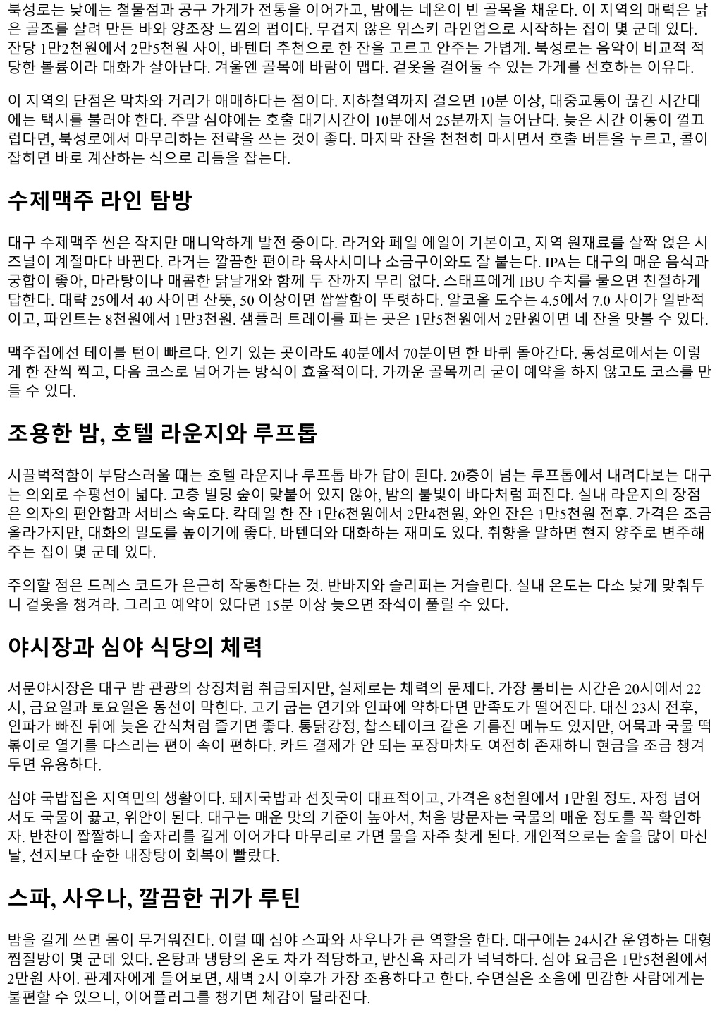 북성로는낮에는철물점과공구가게가전통을이어가고, 밤에는네온이빈골목을채운다. 이지역의매력은낡 은골조를살려만든바와양조장느낌의펍이다. 무겁지않은위스키라인업으로시작하는집이몇군데있다. 잔당 1만2천원에서 2만5천원사이, 바텐더추천으로한잔을고르고안주는가볍게. 북성로는음악이비교적적 당한볼륨이라대화가살아난다. 겨울엔골목에바람이맵다. 겉옷을걸어둘수있는가게를선호하는이유다. 이지역의단점은막차와거리가애매하다는점이다. 지하철역까지걸으면 10분이상, 대중교통이끊긴시간대 에는택시를불러야한다. 주말심야에는호출대기시간이 10분에서 25분까지늘어난다. 늦은시간이동이껄끄 럽다면, 북성로에서마무리하는전략을쓰는것이좋다. 마지막잔을천천히마시면서호출버튼을누르고, 콜이 잡히면바로계산하는식으로리듬을잡는다. 수제맥주라인탐방 대구수제맥주씬은작지만매니악하게발전중이다. 라거와페일에일이기본이고, 지역원재료를살짝얹은시 즈널이계절마다바뀐다. 라거는깔끔한편이라육사시미나소금구이와도잘붙는다. IPA는대구의매운음식과 궁합이좋아, 마라탕이나매콤한닭날개와함께두잔까지무리없다. 스태프에게 IBU 수치를물으면친절하게 답한다. 대략 25에서 40 사이면산뜻, 50 이상이면쌉쌀함이뚜렷하다. 알코올도수는 4.5에서 7.0 사이가일반적 이고, 파인트는 8천원에서 1만3천원. 샘플러트레이를파는곳은 1만5천원에서 2만원이면네잔을맛볼수있다. 맥주집에선테이블턴이빠르다. 인기있는곳이라도 40분에서 70분이면한바퀴돌아간다. 동성로에서는이렇 게한잔씩찍고, 다음코스로넘어가는방식이효율적이다. 가까운골목끼리굳이예약을하지않고도코스를만 들수있다. 조용한밤, 호텔라운지와루프톱 시끌벅적함이부담스러울때는호텔라운지나루프톱바가답이된다. 20층이넘는루프톱에서내려다보는대구 는의외로수평선이넓다. 고층빌딩숲이맞붙어있지않아, 밤의불빛이바다처럼퍼진다. 실내라운지의장점 은의자의편안함과서비스속도다. 칵테일한잔 1만6천원에서 2만4천원, 와인잔은 1만5천원전후. 가격은조금 올라가지만, 대화의밀도를높이기에좋다. 바텐더와대화하는재미도있다. 취향을말하면현지양주로변주해 주는집이몇군데있다. 주의할점은드레스코드가은근히작동한다는것. 반바지와슬리퍼는거슬린다. 실내온도는다소낮게맞춰두 니겉옷을챙겨라. 그리고예약이있다면 15분이상늦으면좌석이풀릴수있다. 야시장과심야식당의체력 서문야시장은대구밤관광의상징처럼취급되지만, 실제로는체력의문제다. 가장붐비는시간은 20시에서 22 시, 금요일과토요일은동선이막힌다. 고기굽는연기와인파에약하다면만족도가떨어진다. 대신 23시전후, 인파가빠진뒤에늦은간식처럼즐기면좋다. 통닭강정, 찹스테이크같은기름진메뉴도있지만, 어묵과국물떡 볶이로열기를다스리는편이속이편하다. 카드결제가안되는포장마차도여전히존재하니현금을조금챙겨 두면유용하다. 심야국밥집은지역민의생활이다. 돼지국밥과선짓국이대표적이고, 가격은 8천원에서 1만원정도. 자정넘어 서도국물이끓고, 위안이된다. 대구는매운맛의기준이높아서, 처음방문자는국물의매운정도를꼭확인하 자. 반찬이짭짤하니술자리를길게이어가다마무리로가면물을자주찾게된다. 개인적으로는술을많이마신 날, 선지보다순한내장탕이회복이빨랐다. 스파, 사우나, 깔끔한귀가루틴 밤을길게쓰면몸이무거워진다. 이럴때심야스파와사우나가큰역할을한다. 대구에는 24시간운영하는대형 찜질방이몇군데있다. 온탕과냉탕의온도차가적당하고, 반신욕자리가넉넉하다. 심야요금은 1만5천원에서 2만원사이. 관계자에게들어보면, 새벽 2시이후가가장조용하다고한다. 수면실은소음에민감한사람에게는 불편할수있으니, 이어플러그를챙기면체감이달라진다.