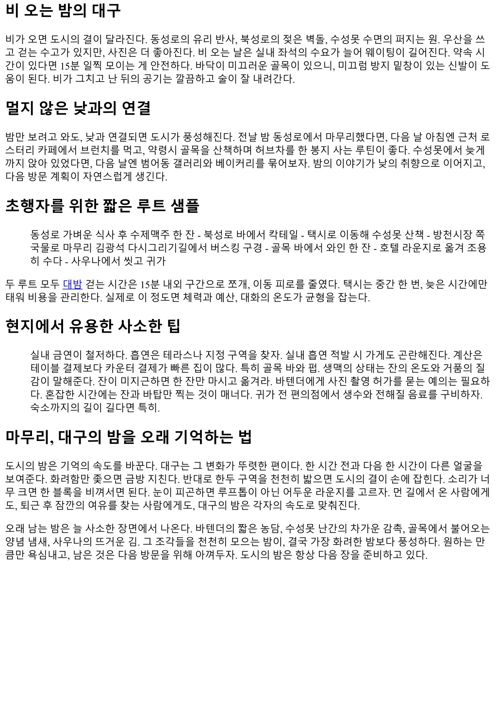 비오는밤의대구 비가오면도시의결이달라진다. 동성로의유리반사, 북성로의젖은벽돌, 수성못수면의퍼지는원. 우산을쓰 고걷는수고가있지만, 사진은더좋아진다. 비오는날은실내좌석의수요가늘어웨이팅이길어진다. 약속시 간이있다면 15분일찍모이는게안전하다. 바닥이미끄러운골목이있으니, 미끄럼방지밑창이있는신발이도 움이된다. 비가그치고난뒤의공기는깔끔하고술이잘내려간다. 멀지않은낮과의연결 밤만보려고와도, 낮과연결되면도시가풍성해진다. 전날밤동성로에서마무리했다면, 다음날아침엔근처로 스터리카페에서브런치를먹고, 약령시골목을산책하며허브차를한봉지사는루틴이좋다. 수성못에서늦게 까지앉아있었다면, 다음날엔범어동갤러리와베이커리를묶어보자. 밤의이야기가낮의취향으로이어지고, 다음방문계획이자연스럽게생긴다. 초행자를위한짧은루트샘플 동성로가벼운식사후수제맥주한잔 - 북성로바에서칵테일 - 택시로이동해수성못산책 - 방천시장쪽 국물로마무리김광석다시그리기길에서버스킹구경 - 골목바에서와인한잔 - 호텔라운지로옮겨조용 히수다 - 사우나에서씻고귀가 두루트모두대밤걷는시간은 15분내외구간으로쪼개, 이동피로를줄였다. 택시는중간한번, 늦은시간에만 태워비용을관리한다. 실제로이정도면체력과예산, 대화의온도가균형을잡는다. 현지에서유용한사소한팁 실내금연이철저하다. 흡연은테라스나지정구역을찾자. 실내흡연적발시가게도곤란해진다. 계산은 테이블결제보다카운터결제가빠른집이많다. 특히골목바와펍. 생맥의상태는잔의온도와거품의질 감이말해준다. 잔이미지근하면한잔만마시고옮겨라. 바텐더에게사진촬영허가를묻는예의는필요하 다. 혼잡한시간에는잔과바탑만찍는것이매너다. 귀가전편의점에서생수와전해질음료를구비하자. 숙소까지의길이길다면특히. 마무리, 대구의밤을오래기억하는법 도시의밤은기억의속도를바꾼다. 대구는그변화가뚜렷한편이다. 한시간전과다음한시간이다른얼굴을 보여준다. 화려함만좇으면금방지친다. 반대로한두구역을천천히밟으면도시의결이손에잡힌다. 소리가너 무크면한블록을비껴서면된다. 눈이피곤하면루프톱이아닌어두운라운지를고르자. 먼길에서온사람에게 도, 퇴근후잠깐의여유를찾는사람에게도, 대구의밤은각자의속도로맞춰진다. 오래남는밤은늘사소한장면에서나온다. 바텐더의짧은농담, 수성못난간의차가운감촉, 골목에서불어오는 양념냄새, 사우나의뜨거운김. 그조각들을천천히모으는밤이, 결국가장화려한밤보다풍성하다. 원하는만 큼만욕심내고, 남은것은다음방문을위해아껴두자. 도시의밤은항상다음장을준비하고있다.