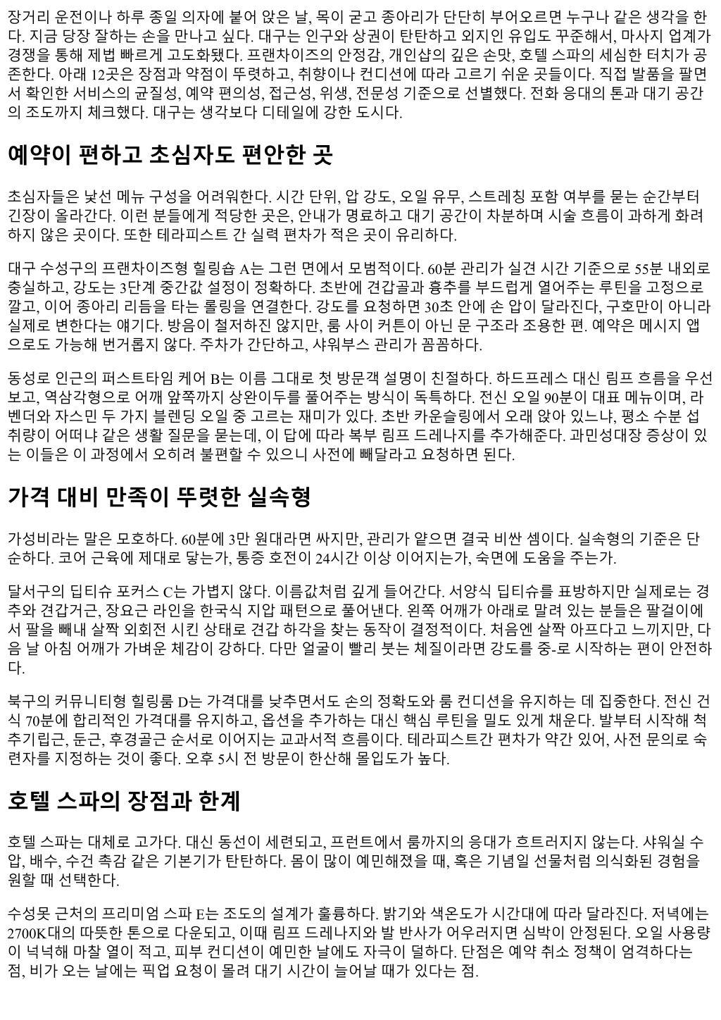 장거리운전이나하루종일의자에붙어앉은날, 목이굳고종아리가단단히부어오르면누구나같은생각을한 다. 지금당장잘하는손을만나고싶다. 대구는인구와상권이탄탄하고외지인유입도꾸준해서, 마사지업계가 경쟁을통해제법빠르게고도화됐다. 프랜차이즈의안정감, 개인샵의깊은손맛, 호텔스파의세심한터치가공 존한다. 아래 12곳은장점과약점이뚜렷하고, 취향이나컨디션에따라고르기쉬운곳들이다. 직접발품을팔면 서확인한서비스의균질성, 예약편의성, 접근성, 위생, 전문성기준으로선별했다. 전화응대의톤과대기공간 의조도까지체크했다. 대구는생각보다디테일에강한도시다. 예약이편하고초심자도편안한곳 초심자들은낯선메뉴구성을어려워한다. 시간단위, 압강도, 오일유무, 스트레칭포함여부를묻는순간부터 긴장이올라간다. 이런분들에게적당한곳은, 안내가명료하고대기공간이차분하며시술흐름이과하게화려 하지않은곳이다. 또한테라피스트간실력편차가적은곳이유리하다. 대구수성구의프랜차이즈형힐링숍 A는그런면에서모범적이다. 60분관리가실견시간기준으로 55분내외로 충실하고, 강도는 3단계중간값설정이정확하다. 초반에견갑골과흉추를부드럽게열어주는루틴을고정으로 깔고, 이어종아리리듬을타는롤링을연결한다. 강도를요청하면 30초안에손압이달라진다, 구호만이아니라 실제로변한다는얘기다. 방음이철저하진않지만, 룸사이커튼이아닌문구조라조용한편. 예약은메시지앱 으로도가능해번거롭지않다. 주차가간단하고, 샤워부스관리가꼼꼼하다. 동성로인근의퍼스트타임케어 B는이름그대로첫방문객설명이친절하다. 하드프레스대신림프흐름을우선 보고, 역삼각형으로어깨앞쪽까지상완이두를풀어주는방식이독특하다. 전신오일 90분이대표메뉴이며, 라 벤더와자스민두가지블렌딩오일중고르는재미가있다. 초반카운슬링에서오래앉아있느냐, 평소수분섭 취량이어떠냐같은생활질문을묻는데, 이답에따라복부림프드레나지를추가해준다. 과민성대장증상이있 는이들은이과정에서오히려불편할수있으니사전에빼달라고요청하면된다. 가격대비만족이뚜렷한실속형 가성비라는말은모호하다. 60분에 3만원대라면싸지만, 관리가얕으면결국비싼셈이다. 실속형의기준은단 순하다. 코어근육에제대로닿는가, 통증호전이 24시간이상이어지는가, 숙면에도움을주는가. 달서구의딥티슈포커스 C는가볍지않다. 이름값처럼깊게들어간다. 서양식딥티슈를표방하지만실제로는경 추와견갑거근, 장요근라인을한국식지압패턴으로풀어낸다. 왼쪽어깨가아래로말려있는분들은팔걸이에 서팔을빼내살짝외회전시킨상태로견갑하각을찾는동작이결정적이다. 처음엔살짝아프다고느끼지만, 다 음날아침어깨가가벼운체감이강하다. 다만얼굴이빨리붓는체질이라면강도를중-로시작하는편이안전하 다. 북구의커뮤니티형힐링룸 D는가격대를낮추면서도손의정확도와룸컨디션을유지하는데집중한다. 전신건 식 70분에합리적인가격대를유지하고, 옵션을추가하는대신핵심루틴을밀도있게채운다. 발부터시작해척 추기립근, 둔근, 후경골근순서로이어지는교과서적흐름이다. 테라피스트간편차가약간있어, 사전문의로숙 련자를지정하는것이좋다. 오후 5시전방문이한산해몰입도가높다. 호텔스파의장점과한계 호텔스파는대체로고가다. 대신동선이세련되고, 프런트에서룸까지의응대가흐트러지지않는다. 샤워실수 압, 배수, 수건촉감같은기본기가탄탄하다. 몸이많이예민해졌을때, 혹은기념일선물처럼의식화된경험을 원할때선택한다. 수성못근처의프리미엄스파 E는조도의설계가훌륭하다. 밝기와색온도가시간대에따라달라진다. 저녁에는 2700K대의따뜻한톤으로다운되고, 이때림프드레나지와발반사가어우러지면심박이안정된다. 오일사용량 이넉넉해마찰열이적고, 피부컨디션이예민한날에도자극이덜하다. 단점은예약취소정책이엄격하다는 점, 비가오는날에는픽업요청이몰려대기시간이늘어날때가있다는점.