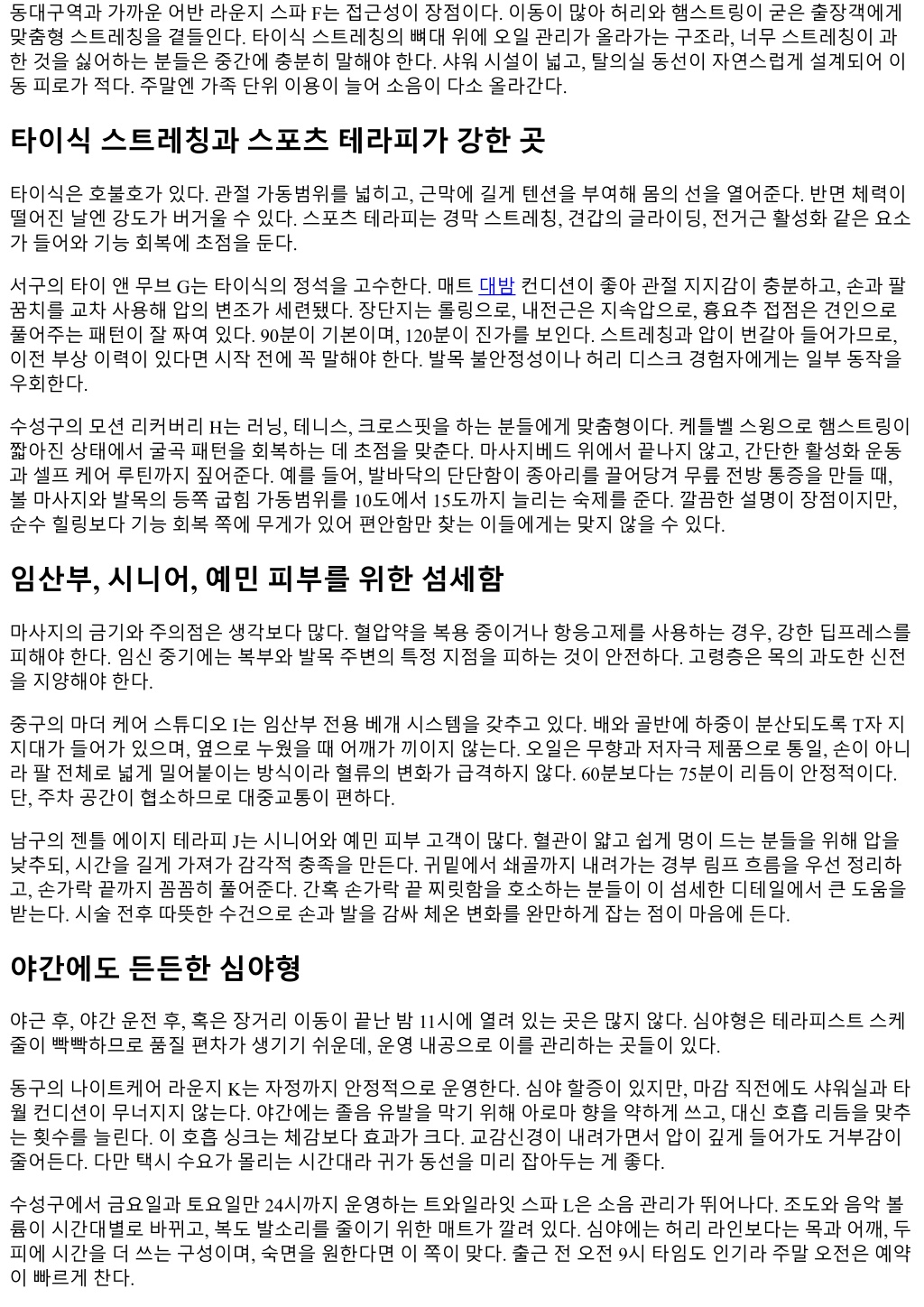 동대구역과가까운어반라운지스파 F는접근성이장점이다. 이동이많아허리와햄스트링이굳은출장객에게 맞춤형스트레칭을곁들인다. 타이식스트레칭의뼈대위에오일관리가올라가는구조라, 너무스트레칭이과 한것을싫어하는분들은중간에충분히말해야한다. 샤워시설이넓고, 탈의실동선이자연스럽게설계되어이 동피로가적다. 주말엔가족단위이용이늘어소음이다소올라간다. 타이식스트레칭과스포츠테라피가강한곳 타이식은호불호가있다. 관절가동범위를넓히고, 근막에길게텐션을부여해몸의선을열어준다. 반면체력이 떨어진날엔강도가버거울수있다. 스포츠테라피는경막스트레칭, 견갑의글라이딩, 전거근활성화같은요소 가들어와기능회복에초점을둔다. 서구의타이앤무브 G는타이식의정석을고수한다. 매트대밤컨디션이좋아관절지지감이충분하고, 손과팔 꿈치를교차사용해압의변조가세련됐다. 장단지는롤링으로, 내전근은지속압으로, 흉요추접점은견인으로 풀어주는패턴이잘짜여있다. 90분이기본이며, 120분이진가를보인다. 스트레칭과압이번갈아들어가므로, 이전부상이력이있다면시작전에꼭말해야한다. 발목불안정성이나허리디스크경험자에게는일부동작을 우회한다. 수성구의모션리커버리 H는러닝, 테니스, 크로스핏을하는분들에게맞춤형이다. 케틀벨스윙으로햄스트링이 짧아진상태에서굴곡패턴을회복하는데초점을맞춘다. 마사지베드위에서끝나지않고, 간단한활성화운동 과셀프케어루틴까지짚어준다. 예를들어, 발바닥의단단함이종아리를끌어당겨무릎전방통증을만들때, 볼마사지와발목의등쪽굽힘가동범위를 10도에서 15도까지늘리는숙제를준다. 깔끔한설명이장점이지만, 순수힐링보다기능회복쪽에무게가있어편안함만찾는이들에게는맞지않을수있다. 임산부, 시니어, 예민피부를위한섬세함 마사지의금기와주의점은생각보다많다. 혈압약을복용중이거나항응고제를사용하는경우, 강한딥프레스를 피해야한다. 임신중기에는복부와발목주변의특정지점을피하는것이안전하다. 고령층은목의과도한신전 을지양해야한다. 중구의마더케어스튜디오 I는임산부전용베개시스템을갖추고있다. 배와골반에하중이분산되도록 T자지 지대가들어가있으며, 옆으로누웠을때어깨가끼이지않는다. 오일은무향과저자극제품으로통일, 손이아니 라팔전체로넓게밀어붙이는방식이라혈류의변화가급격하지않다. 60분보다는 75분이리듬이안정적이다. 단, 주차공간이협소하므로대중교통이편하다. 남구의젠틀에이지테라피 J는시니어와예민피부고객이많다. 혈관이얇고쉽게멍이드는분들을위해압을 낮추되, 시간을길게가져가감각적충족을만든다. 귀밑에서쇄골까지내려가는경부림프흐름을우선정리하 고, 손가락끝까지꼼꼼히풀어준다. 간혹손가락끝찌릿함을호소하는분들이이섬세한디테일에서큰도움을 받는다. 시술전후따뜻한수건으로손과발을감싸체온변화를완만하게잡는점이마음에든다. 야간에도든든한심야형 야근후, 야간운전후, 혹은장거리이동이끝난밤 11시에열려있는곳은많지않다. 심야형은테라피스트스케 줄이빡빡하므로품질편차가생기기쉬운데, 운영내공으로이를관리하는곳들이있다. 동구의나이트케어라운지 K는자정까지안정적으로운영한다. 심야할증이있지만, 마감직전에도샤워실과타 월컨디션이무너지지않는다. 야간에는졸음유발을막기위해아로마향을약하게쓰고, 대신호흡리듬을맞추 는횟수를늘린다. 이호흡싱크는체감보다효과가크다. 교감신경이내려가면서압이깊게들어가도거부감이 줄어든다. 다만택시수요가몰리는시간대라귀가동선을미리잡아두는게좋다. 수성구에서금요일과토요일만 24시까지운영하는트와일라잇스파 L은소음관리가뛰어나다. 조도와음악볼 륨이시간대별로바뀌고, 복도발소리를줄이기위한매트가깔려있다. 심야에는허리라인보다는목과어깨, 두 피에시간을더쓰는구성이며, 숙면을원한다면이쪽이맞다. 출근전오전 9시타임도인기라주말오전은예약 이빠르게찬다.