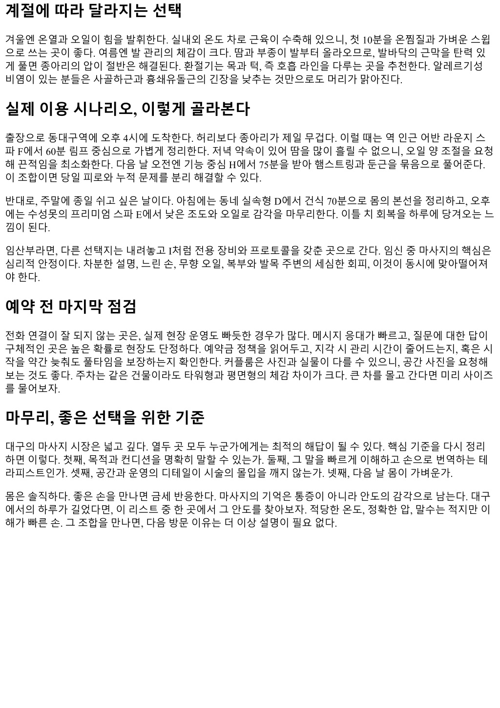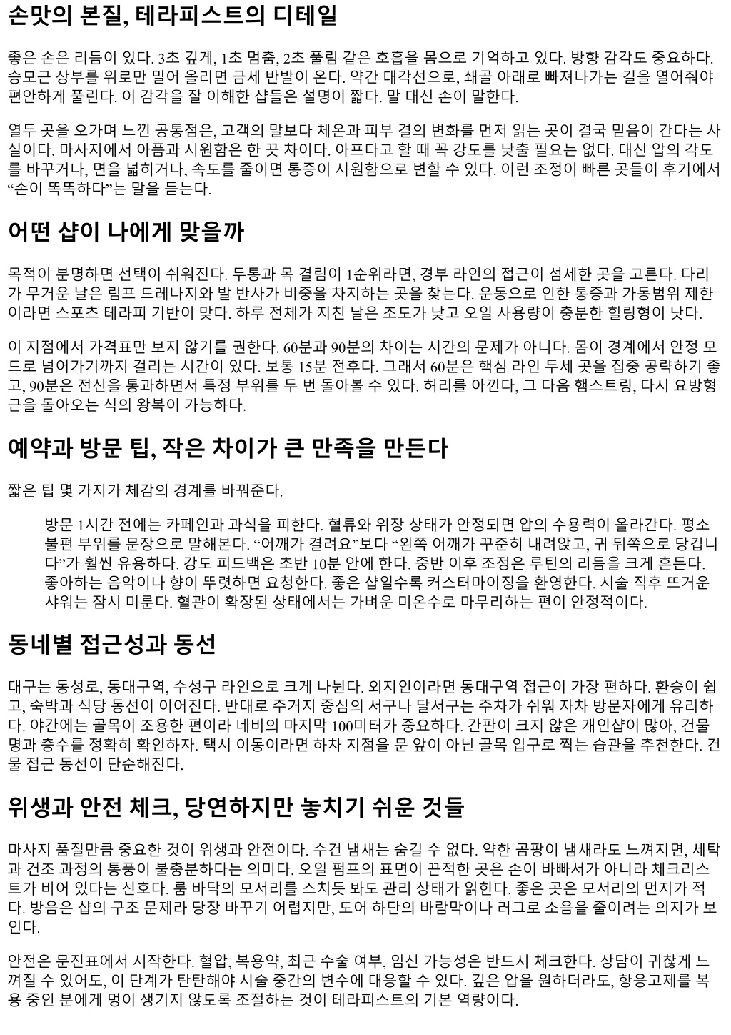 손맛의본질, 테라피스트의디테일 좋은손은리듬이있다. 3초깊게, 1초멈춤, 2초풀림같은호흡을몸으로기억하고있다. 방향감각도중요하다. 승모근상부를위로만밀어올리면금세반발이온다. 약간대각선으로, 쇄골아래로빠져나가는길을열어줘야 편안하게풀린다. 이감각을잘이해한샵들은설명이짧다. 말대신손이말한다. 열두곳을오가며느낀공통점은, 고객의말보다체온과피부결의변화를먼저읽는곳이결국믿음이간다는사 실이다. 마사지에서아픔과시원함은한끗차이다. 아프다고할때꼭강도를낮출필요는없다. 대신압의각도 를바꾸거나, 면을넓히거나, 속도를줄이면통증이시원함으로변할수있다. 이런조정이빠른곳들이후기에서 “손이똑똑하다”는말을듣는다. 어떤샵이나에게맞을까 목적이분명하면선택이쉬워진다. 두통과목결림이 1순위라면, 경부라인의접근이섬세한곳을고른다. 다리 가무거운날은림프드레나지와발반사가비중을차지하는곳을찾는다. 운동으로인한통증과가동범위제한 이라면스포츠테라피기반이맞다. 하루전체가지친날은조도가낮고오일사용량이충분한힐링형이낫다. 이지점에서가격표만보지않기를권한다. 60분과 90분의차이는시간의문제가아니다. 몸이경계에서안정모 드로넘어가기까지걸리는시간이있다. 보통 15분전후다. 그래서 60분은핵심라인두세곳을집중공략하기좋 고, 90분은전신을통과하면서특정부위를두번돌아볼수있다. 허리를아낀다, 그다음햄스트링, 다시요방형 근을돌아오는식의왕복이가능하다. 예약과방문팁, 작은차이가큰만족을만든다 짧은팁몇가지가체감의경계를바꿔준다. 방문 1시간전에는카페인과과식을피한다. 혈류와위장상태가안정되면압의수용력이올라간다. 평소 불편부위를문장으로말해본다. “어깨가결려요”보다 “왼쪽어깨가꾸준히내려앉고, 귀뒤쪽으로당깁니 다”가훨씬유용하다. 강도피드백은초반 10분안에한다. 중반이후조정은루틴의리듬을크게흔든다. 좋아하는음악이나향이뚜렷하면요청한다. 좋은샵일수록커스터마이징을환영한다. 시술직후뜨거운 샤워는잠시미룬다. 혈관이확장된상태에서는가벼운미온수로마무리하는편이안정적이다. 동네별접근성과동선 대구는동성로, 동대구역, 수성구라인으로크게나뉜다. 외지인이라면동대구역접근이가장편하다. 환승이쉽 고, 숙박과식당동선이이어진다. 반대로주거지중심의서구나달서구는주차가쉬워자차방문자에게유리하 다. 야간에는골목이조용한편이라네비의마지막 100미터가중요하다. 간판이크지않은개인샵이많아, 건물 명과층수를정확히확인하자. 택시이동이라면하차지점을문앞이아닌골목입구로찍는습관을추천한다. 건 물접근동선이단순해진다. 위생과안전체크, 당연하지만놓치기쉬운것들 마사지품질만큼중요한것이위생과안전이다. 수건냄새는숨길수없다. 약한곰팡이냄새라도느껴지면, 세탁 과건조과정의통풍이불충분하다는의미다. 오일펌프의표면이끈적한곳은손이바빠서가아니라체크리스 트가비어있다는신호다. 룸바닥의모서리를스치듯봐도관리상태가읽힌다. 좋은곳은모서리의먼지가적 다. 방음은샵의구조문제라당장바꾸기어렵지만, 도어하단의바람막이나러그로소음을줄이려는의지가보 인다. 안전은문진표에서시작한다. 혈압, 복용약, 최근수술여부, 임신가능성은반드시체크한다. 상담이귀찮게느 껴질수있어도, 이단계가탄탄해야시술중간의변수에대응할수있다. 깊은압을원하더라도, 항응고제를복 용중인분에게멍이생기지않도록조절하는것이테라피스트의기본역량이다.