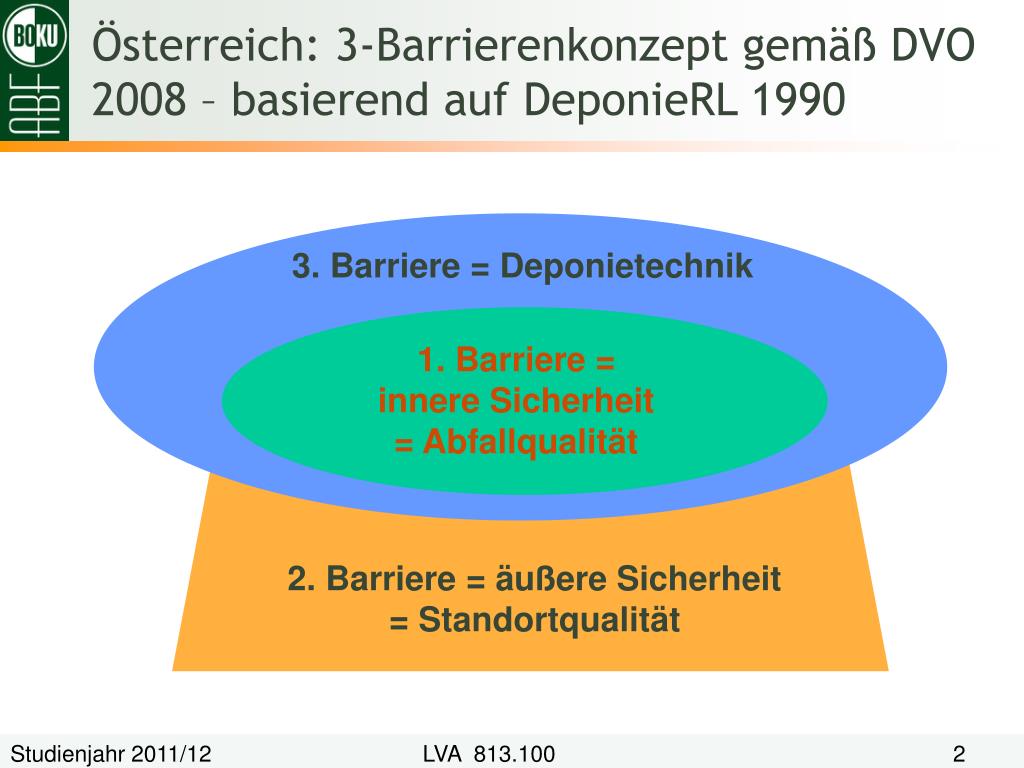 3. Barriere = Deponietechnik 1. Barriere = innere Sicherheit = Abfallqualität 2. Barriere = äußere Sicherheit = Standortqualität Österreich: 3-Barrierenkonzept gemäß DVO 2008 – basierend auf DeponieRL 1990