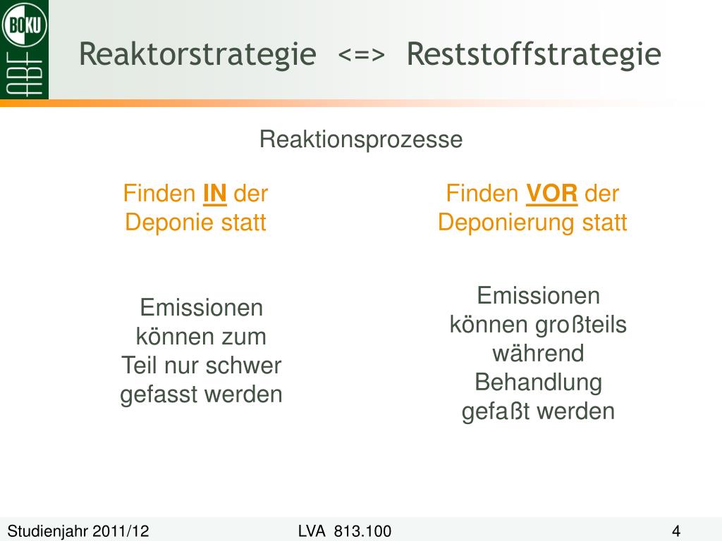 Reaktorstrategie <=> Reststoffstrategie Reaktionsprozesse Finden IN der Deponie statt Finden VOR der Deponierung statt Emissionen können großteils während Behandlung gefaßt werden Emissionen können zum Teil nur schwer gefasst werden