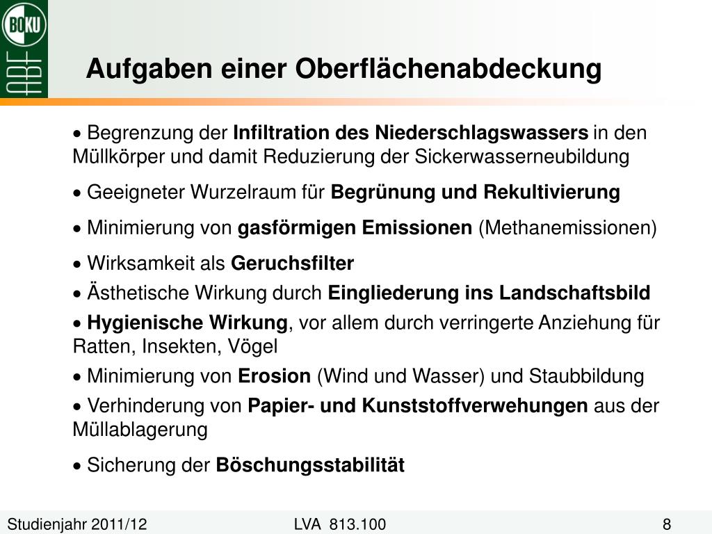 Aufgaben einer Oberflächenabdeckung • Begrenzung der Infiltration des Niederschlagswassers in den Müllkörper und damit Reduzierung der Sickerwasserneubildung • Geeigneter Wurzelraum für Begrünung und Rekultivierung • Minimierung von gasförmigen Emissionen (Methanemissionen) • Wirksamkeit als Geruchsfilter • Ästhetische Wirkung durch Eingliederung ins Landschaftsbild • Hygienische Wirkung, vor allem durch verringerte Anziehung für Ratten, Insekten, Vögel • Minimierung von Erosion (Wind und Wasser) und Staubbildung • Verhinderung von Papier- und Kunststoffverwehungen aus der Müllablagerung • Sicherung der Böschungsstabilität