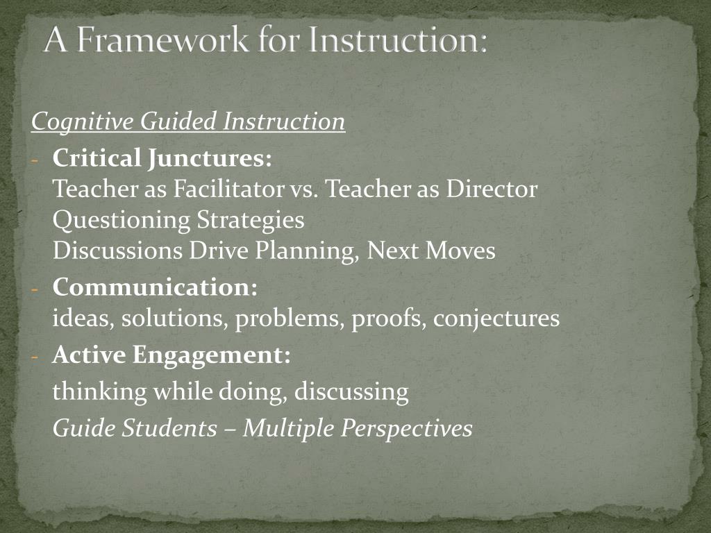 A Framework for Instruction: Cognitive Guided Instruction • Critical Junctures: Teacher as Facilitator vs. Teacher as DirectorQuestioning StrategiesDiscussions Drive Planning, Next Moves • Communication: ideas, solutions, problems, proofs, conjectures • Active Engagement: thinking while doing, discussing Guide Students – Multiple Perspectives