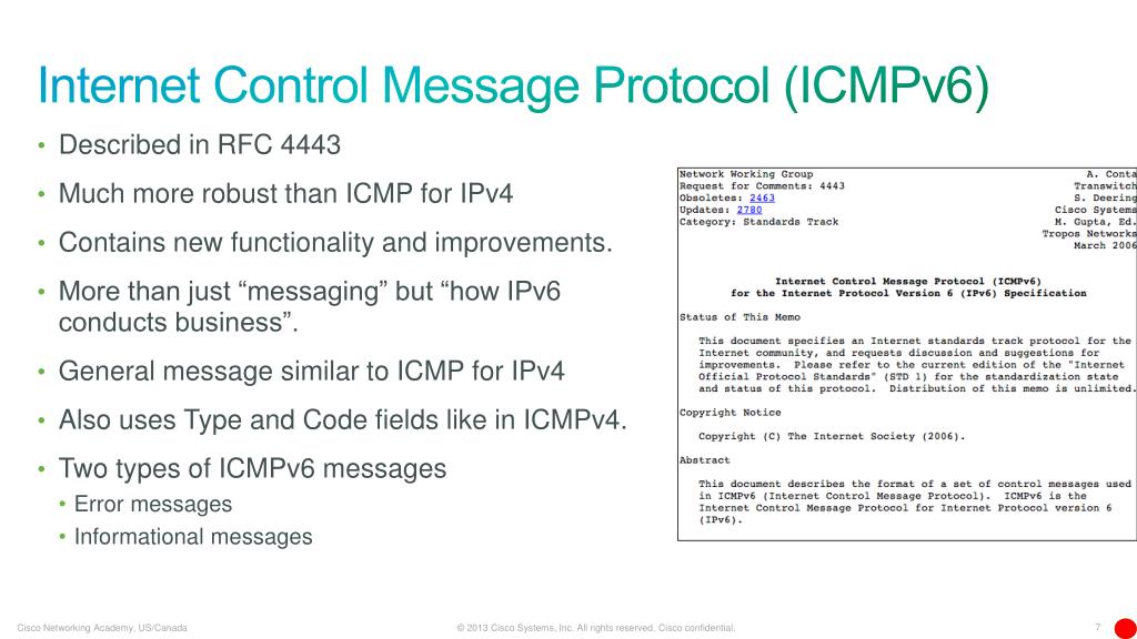 Internet Control Message Protocol (ICMPv6) • Described in RFC 4443 • Much more robust than ICMP for IPv4 • Contains new functionality and improvements. • More than just “messaging” but “how IPv6 conducts business”. • General message similar to ICMP for IPv4 • Also uses Type and Code fields like in ICMPv4. • Two types of ICMPv6 messages • Error messages • Informational messages