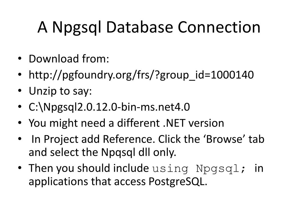 A Npgsql Database Connection • Download from: • http://pgfoundry.org/frs/?group_id=1000140 • Unzip to say: • C:\Npgsql2.0.12.0-bin-ms.net4.0 • You might need a different .NET version • In Project add Reference. Click the ‘Browse’ tab and select the Npqsqldll only. • Then you should include using Npgsql; in applications that access PostgreSQL.