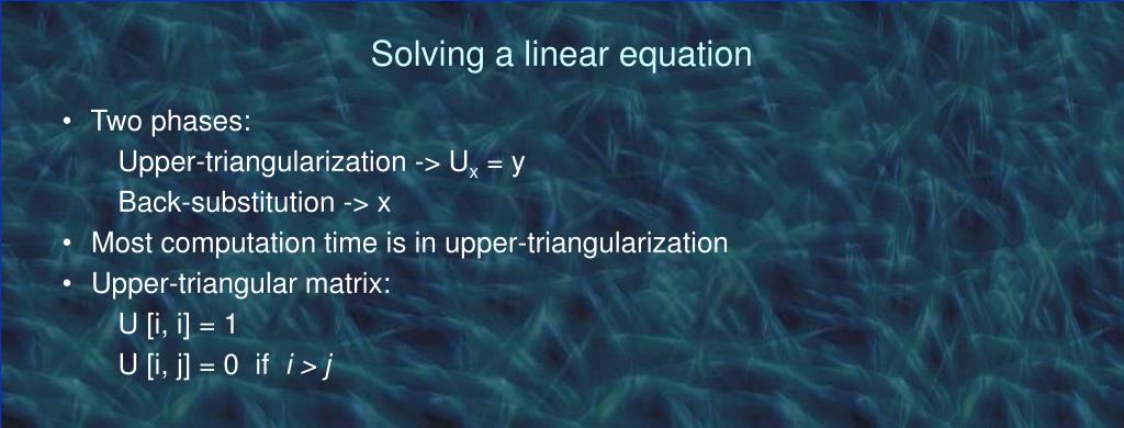 Solving a linear equation • Two phases: Upper-triangularization -> Ux = y Back-substitution -> x • Most computation time is in upper-triangularization • Upper-triangular matrix: U [i, i] = 1 U [i, j] = 0 if i > j