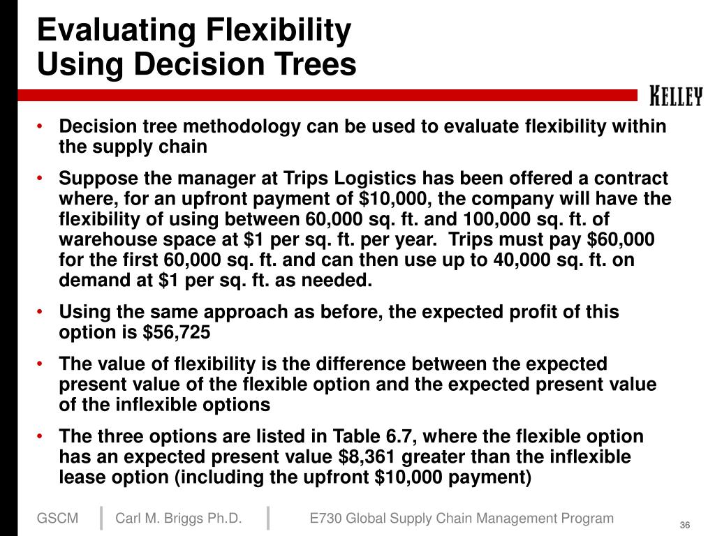 Evaluating FlexibilityUsing Decision Trees • Decision tree methodology can be used to evaluate flexibility within the supply chain • Suppose the manager at Trips Logistics has been offered a contract where, for an upfront payment of $10,000, the company will have the flexibility of using between 60,000 sq. ft. and 100,000 sq. ft. of warehouse space at $1 per sq. ft. per year. Trips must pay $60,000 for the first 60,000 sq. ft. and can then use up to 40,000 sq. ft. on demand at $1 per sq. ft. as needed. • Using the same approach as before, the expected profit of this option is $56,725 • The value of flexibility is the difference between the expected present value of the flexible option and the expected present value of the inflexible options • The three options are listed in Table 6.7, where the flexible option has an expected present value $8,361 greater than the inflexible lease option (including the upfront $10,000 payment)