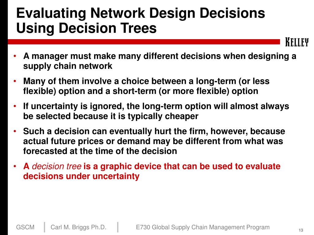 Evaluating Network Design Decisions Using Decision Trees • A manager must make many different decisions when designing a supply chain network • Many of them involve a choice between a long-term (or less flexible) option and a short-term (or more flexible) option • If uncertainty is ignored, the long-term option will almost always be selected because it is typically cheaper • Such a decision can eventually hurt the firm, however, because actual future prices or demand may be different from what was forecasted at the time of the decision • A decision tree is a graphic device that can be used to evaluate decisions under uncertainty