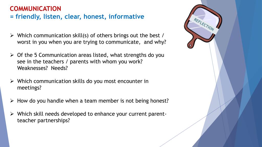 COMMUNICATION • = friendly, listen, clear, honest, informative • Which communication skill(s) of others brings out the best / worst in you when you are trying to communicate, and why? • Of the 5 Communication areas listed, what strengths do you see in the teachers / parents with whom you work? Weaknesses? Needs? • Which communication skills do you most encounter in meetings? • How do you handle when a team member is not being honest? • Which skill needs developed to enhance your current parent-teacher partnerships? REFLECTION
