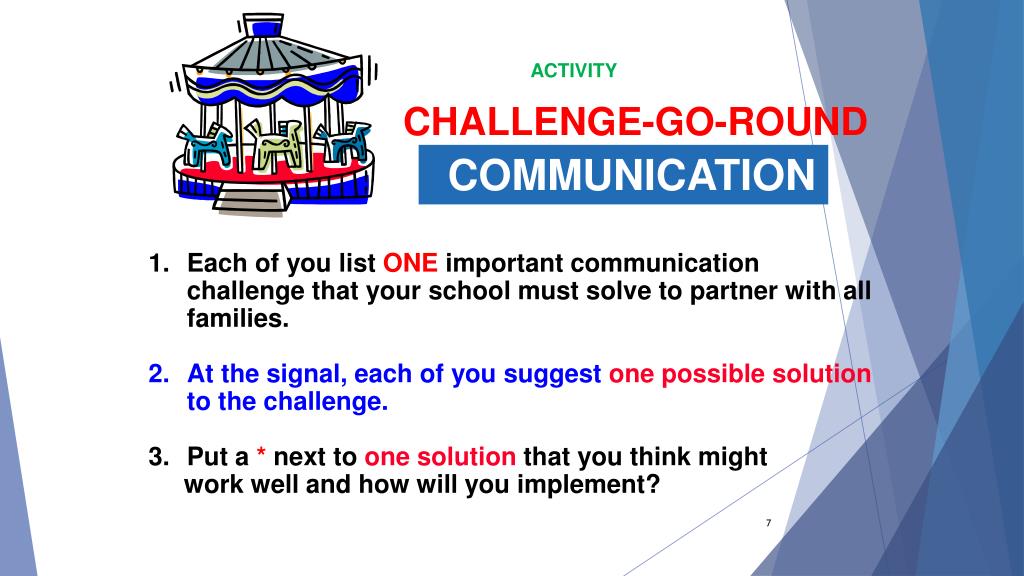 COMMUNICATION ACTIVITY CHALLENGE-GO-ROUND • Each of you list ONE important communication challenge that your school must solve to partner with all families. • At the signal, each of you suggest one possible solution to the challenge. • Put a * next to one solution that you think might • work well and how will you implement?