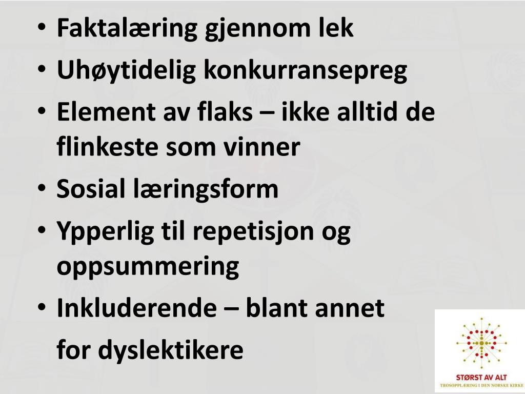 Faktalæring gjennom lek • Uhøytidelig konkurransepreg • Element av flaks – ikke alltid de flinkeste som vinner • Sosial læringsform • Ypperlig til repetisjon og oppsummering • Inkluderende – blant annet for dyslektikere