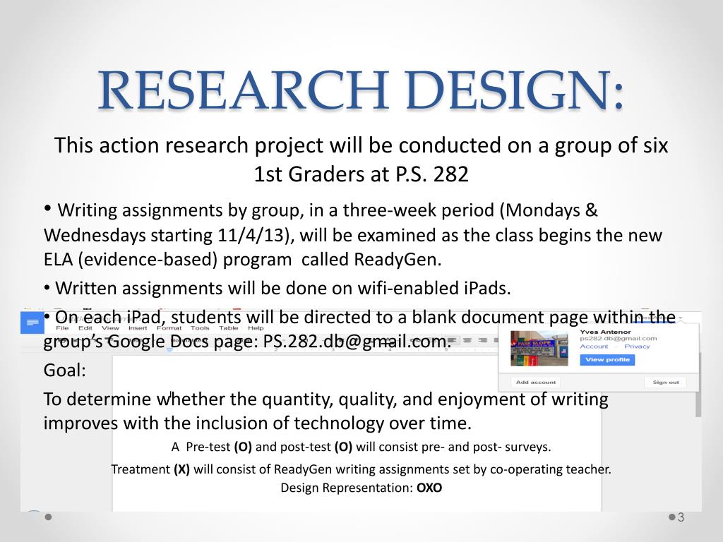 RESEARCH DESIGN: This action research project will be conducted on a group of six 1st Graders at P.S. 282 • Writing assignments by group, in a three-week period (Mondays & Wednesdays starting 11/4/13), will be examined as the class begins the new ELA (evidence-based) program called ReadyGen. • Written assignments will be done on wifi-enabled iPads. • On each iPad, students will be directed to a blank document page within the group’s Google Docs page: PS.282.db@gmail.com. Goal: To determine whether the quantity, quality, and enjoyment of writing improves with the inclusion of technology over time. A Pre-test (O) and post-test (O) will consist pre- and post- surveys. Treatment (X) will consist of ReadyGen writing assignments set by co-operating teacher.Design Representation: OXO