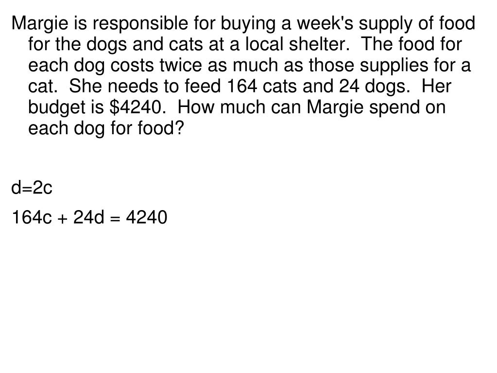 Margie is responsible for buying a week's supply of food for the dogs and cats at a local shelter. The food for each dog costs twice as much as those supplies for a cat. She needs to feed 164 cats and 24 dogs. Her budget is $4240. How much can Margie spend on each dog for food? • d=2c • 164c + 24d = 4240