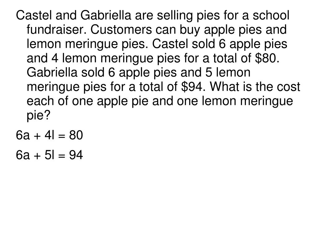 Castel and Gabriella are selling pies for a school fundraiser. Customers can buy apple pies and lemon meringue pies. Castel sold 6 apple pies and 4 lemon meringue pies for a total of $80. Gabriella sold 6 apple pies and 5 lemon meringue pies for a total of $94. What is the cost each of one apple pie and one lemon meringue pie? • 6a + 4l = 80 • 6a + 5l = 94