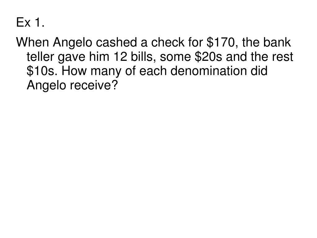 Ex 1. • When Angelo cashed a check for $170, the bank teller gave him 12 bills, some $20s and the rest $10s. How many of each denomination did Angelo receive?