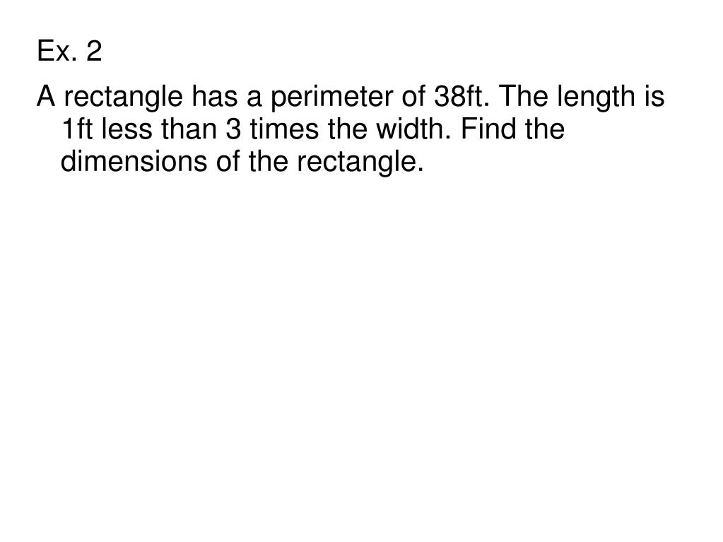 Ex. 2 • A rectangle has a perimeter of 38ft. The length is 1ft less than 3 times the width. Find the dimensions of the rectangle.