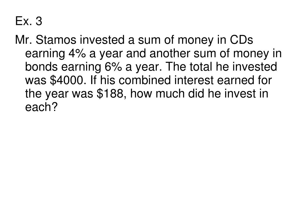 Ex. 3 • Mr. Stamos invested a sum of money in CDs earning 4% a year and another sum of money in bonds earning 6% a year. The total he invested was $4000. If his combined interest earned for the year was $188, how much did he invest in each?