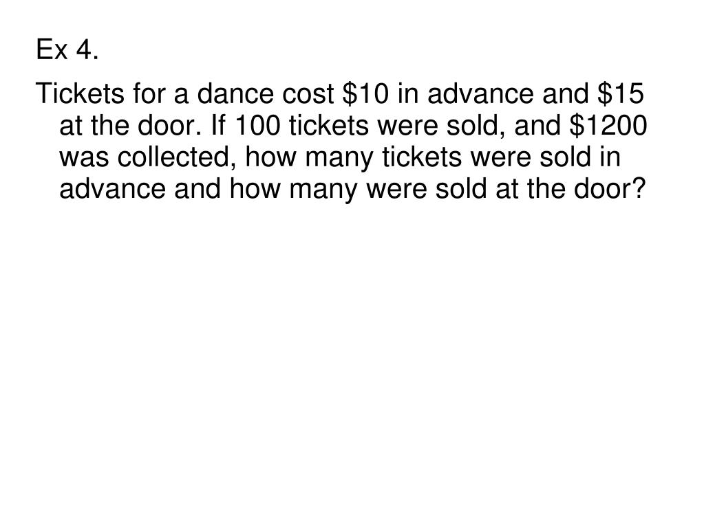 Ex 4. • Tickets for a dance cost $10 in advance and $15 at the door. If 100 tickets were sold, and $1200 was collected, how many tickets were sold in advance and how many were sold at the door?