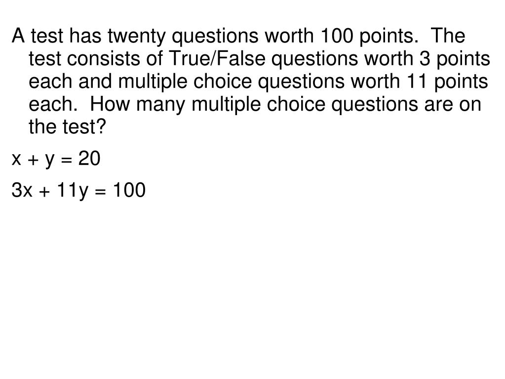 A test has twenty questions worth 100 points. The test consists of True/False questions worth 3 points each and multiple choice questions worth 11 points each. How many multiple choice questions are on the test? • x + y = 20 • 3x + 11y = 100